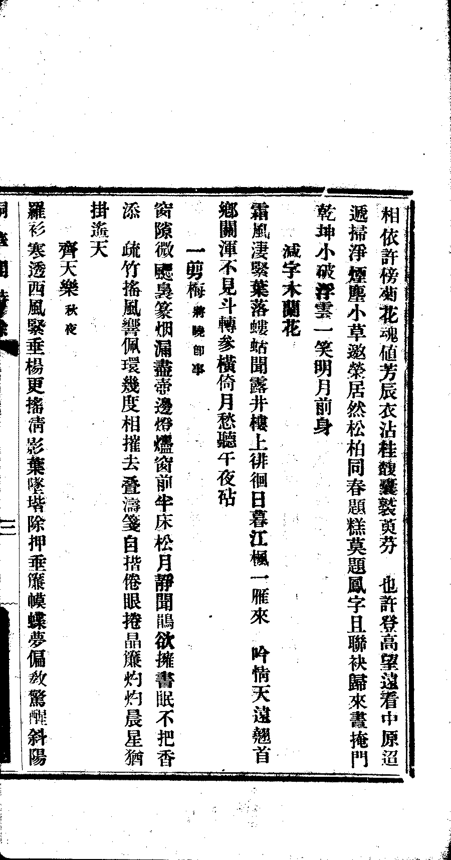 | (PRINT FRIENDLY VERSION) 桐華閣詩集:詩草三卷,詩餘一卷(清慶鳳暉撰)。民國初年(1912)刊本 ![]() 頁碼 : 4.3a | 点 击 放 大 | 返回 |