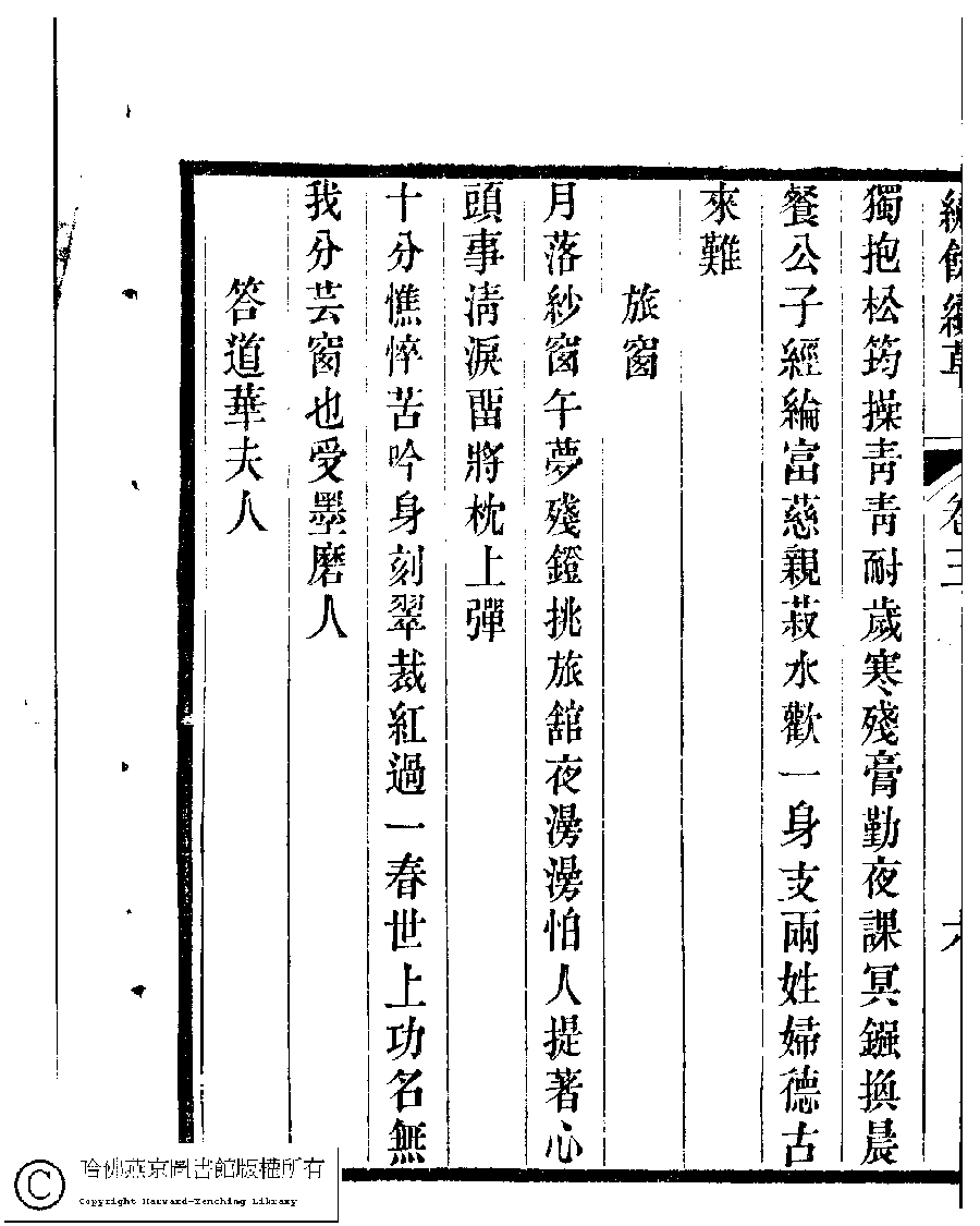 | (PRINT FRIENDLY VERSION) 繡餘續草﹕五卷(清歸懋儀撰)。清道光十二年 (1832)刻本 ![]() 頁碼 : 3.6b | 点 击 放 大 | 返回 |