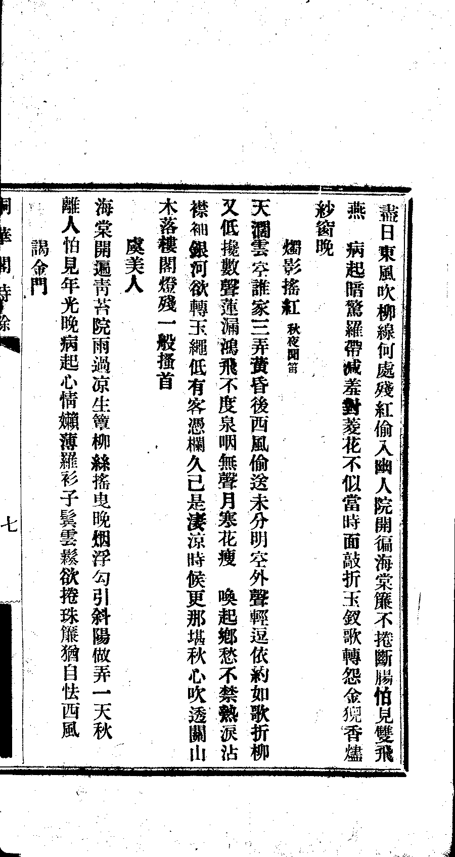 | (PRINT FRIENDLY VERSION) 桐華閣詩集:詩草三卷,詩餘一卷(清慶鳳暉撰)。民國初年(1912)刊本 ![]() 頁碼 : 4.7a | 点 击 放 大 | 返回 |