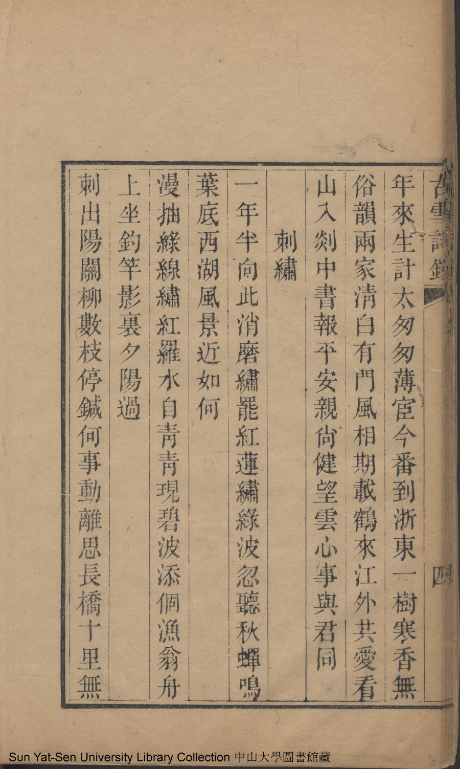 | (PRINT FRIENDLY VERSION) 古雪詩鈔:一卷, 續鈔: 一卷, 詩餘:一卷(清楊繼端撰)。清嘉慶十四年(1809)刻本 ![]() 頁碼 : 1.詩鈔.4b | 点 击 放 大 | 古雪詩鈔:一卷, 續鈔: 一卷, 詩餘:一卷(清楊繼端撰)。清嘉慶十四年(1809)刻本![]() 頁碼 : 1.詩鈔.4a | 点 击 放 大 | 返回 |