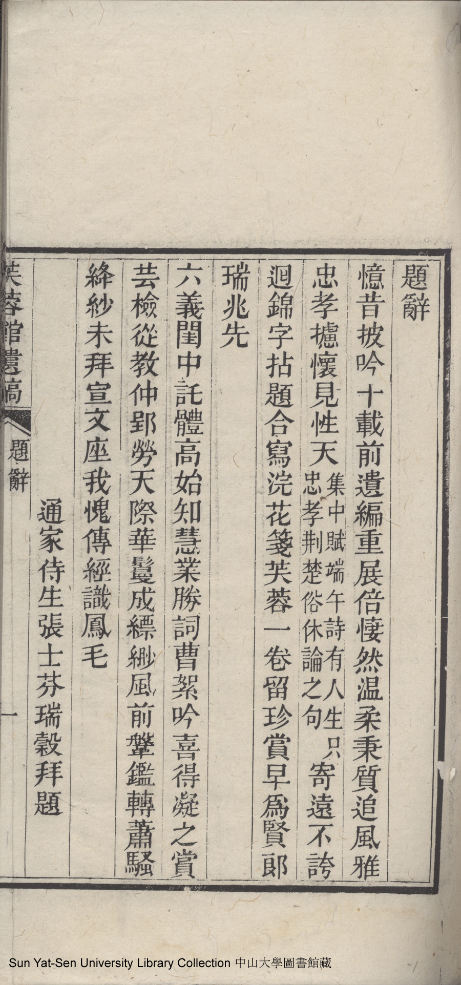 | (PRINT FRIENDLY VERSION) 芙蓉館遺稿:一卷(清史印玉撰)。同治十三年甲戌(1874)刊本 ![]() 頁碼 : 題辭.1a | 点 击 放 大 | 返回 |