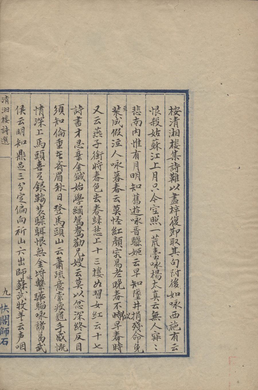 | (PRINT FRIENDLY VERSION) 清湘樓詩選:一卷 (清凌興鳳撰)。清光緒六年(1880)快閣師石山房抄本 ![]() 頁碼 : 桉.9b | 点 击 放 大 | 清湘樓詩選:一卷 (清凌興鳳撰)。清光緒六年(1880)快閣師石山房抄本![]() 頁碼 : 桉.9a | 点 击 放 大 | 返回 |