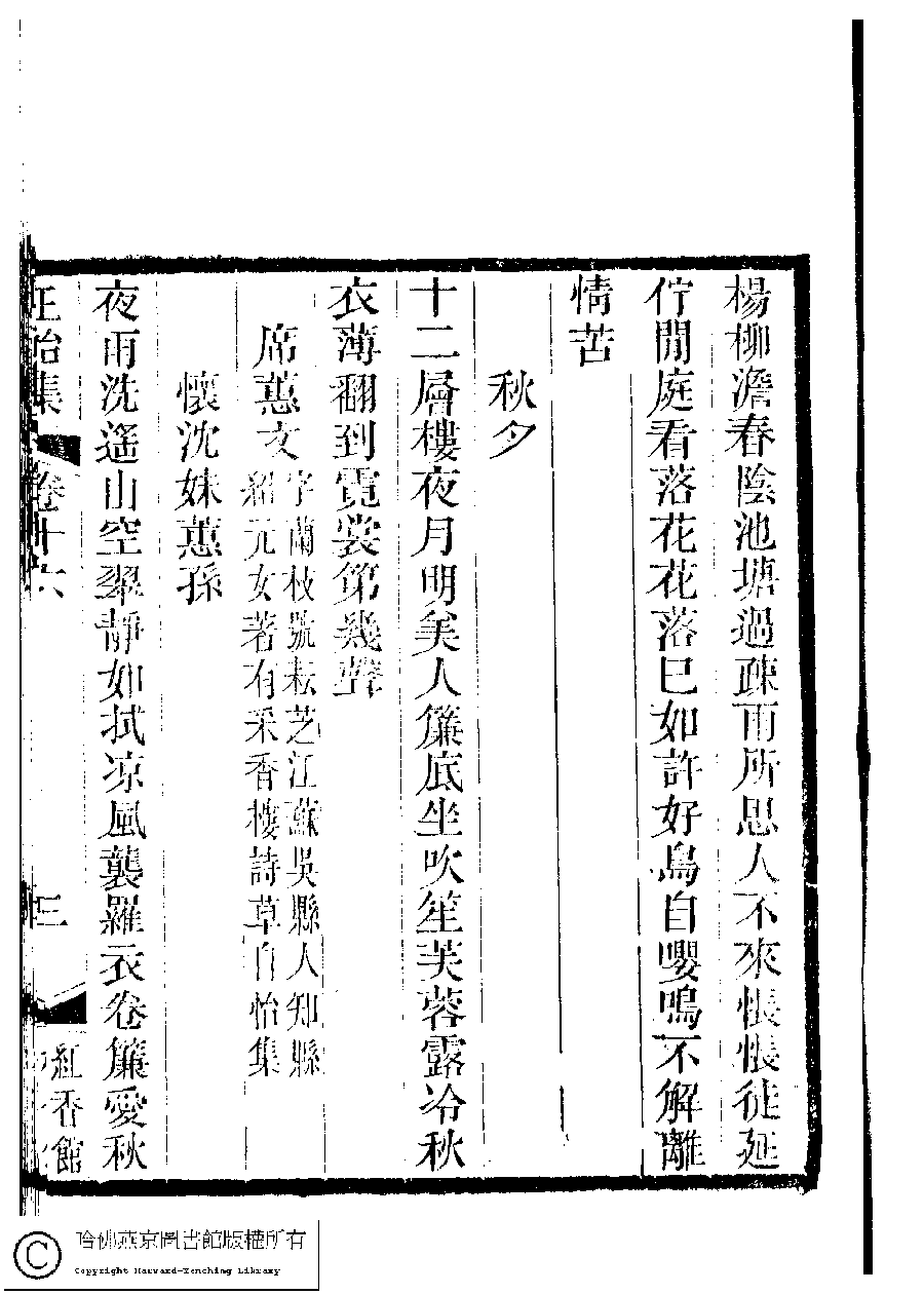 | 原書: 國朝閨秀正始集﹕二十卷﹐附錄﹕一卷﹐補遺﹕一卷﹐又附題詞﹕一卷(清惲珠輯) |