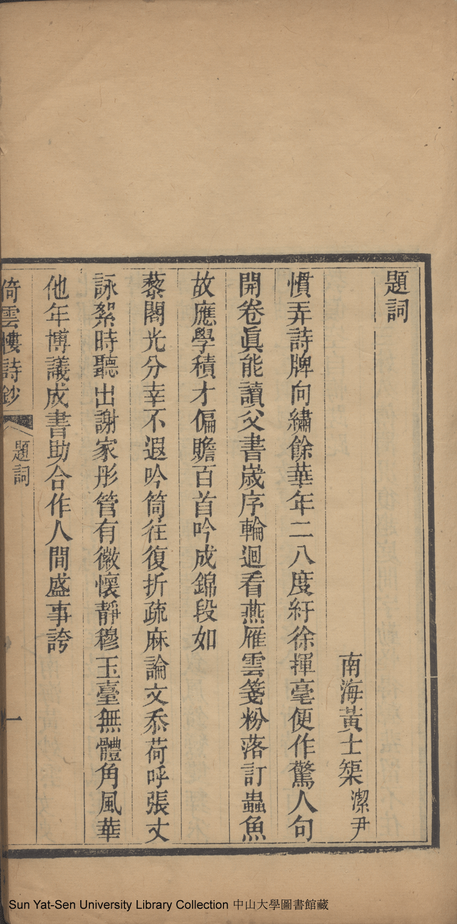 | (PRINT FRIENDLY VERSION) 倚雲樓詩鈔:一卷(清劉月娟撰)。民國元年(1912)刻本 ![]() 頁碼 : 題詞1a | 点 击 放 大 | 返回 |