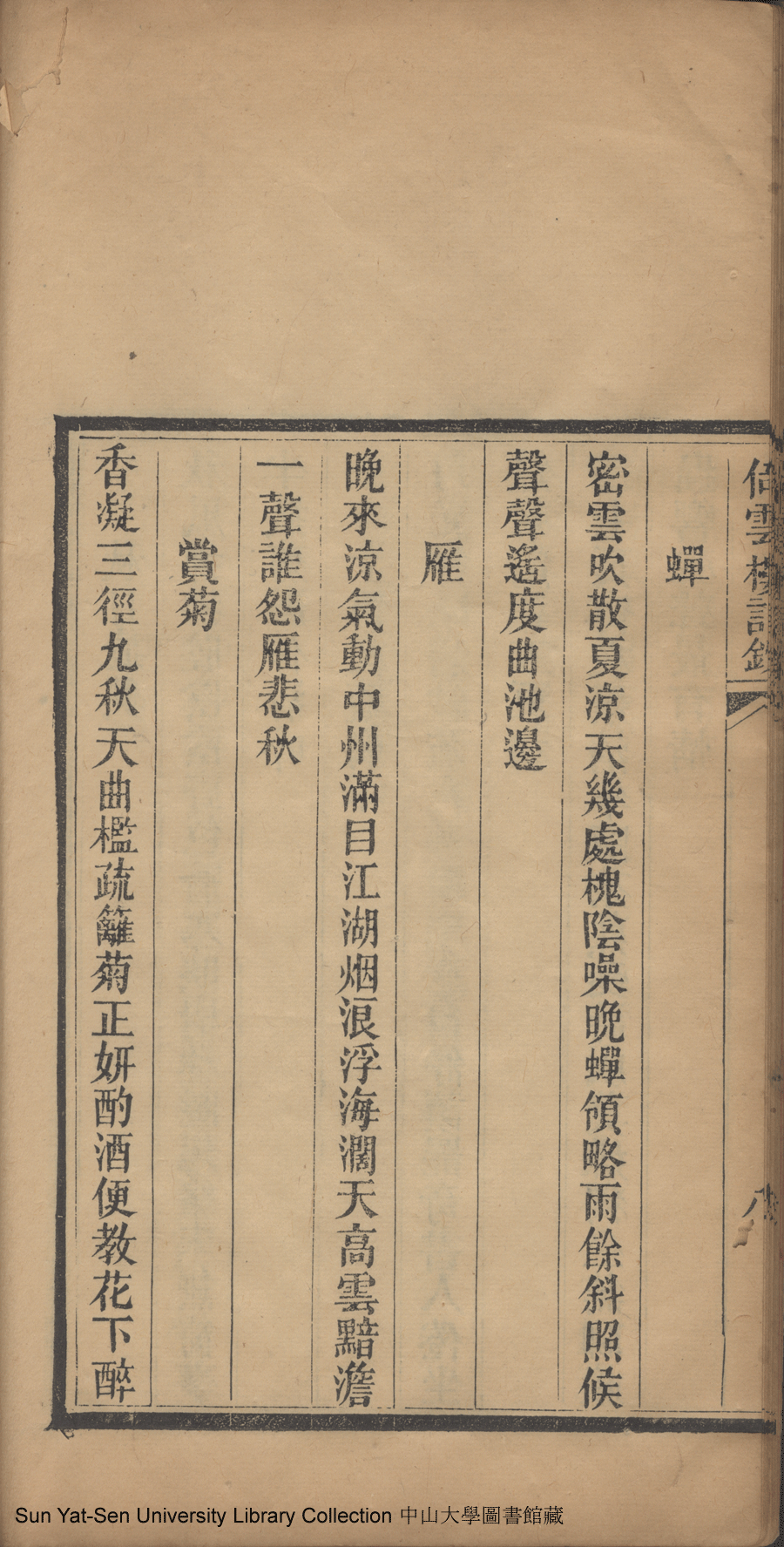 | (PRINT FRIENDLY VERSION) 倚雲樓詩鈔:一卷(清劉月娟撰)。民國元年(1912)刻本 ![]() 頁碼 : 詩鈔8b | 点 击 放 大 | 返回 |