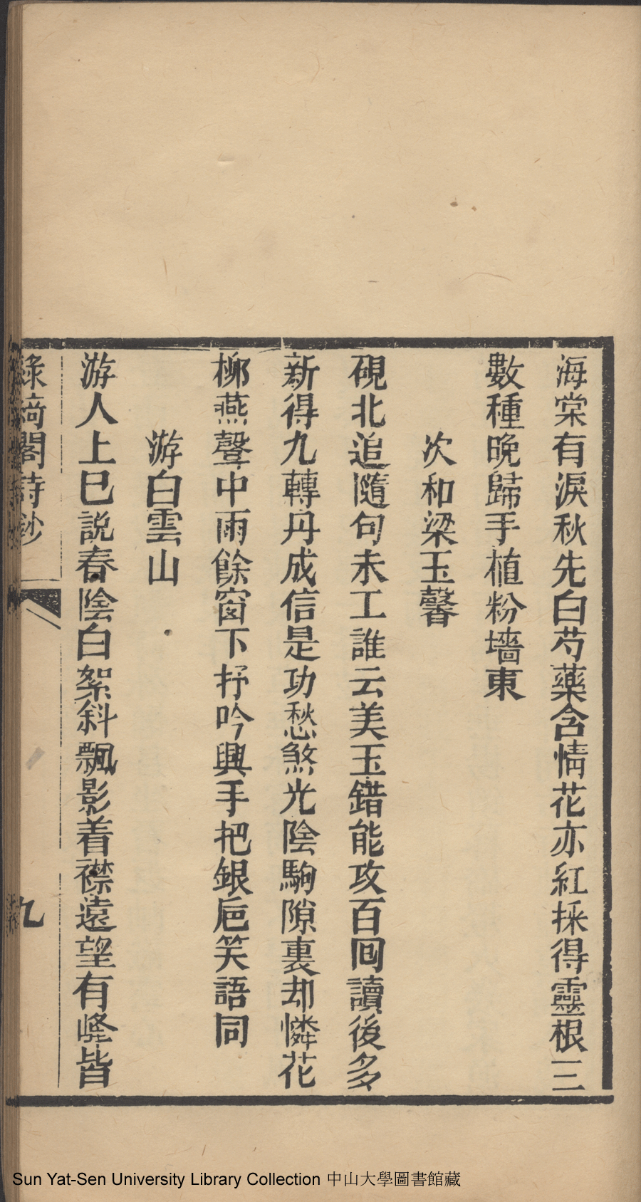 | (PRINT FRIENDLY VERSION) 綠綺閣詩鈔:一卷(清李佩珍撰)。清光緒二十六年(1900)刊本 ![]() 頁碼 : 1.9a | 点 击 放 大 | 返回 |