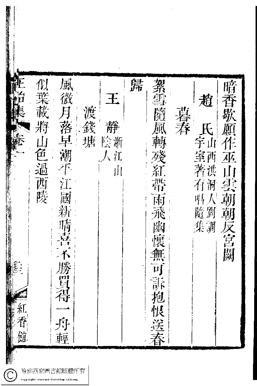 | 原書: 國朝閨秀正始集﹕二十卷﹐附錄﹕一卷﹐補遺﹕一卷﹐又附題詞﹕一卷(清惲珠輯) |