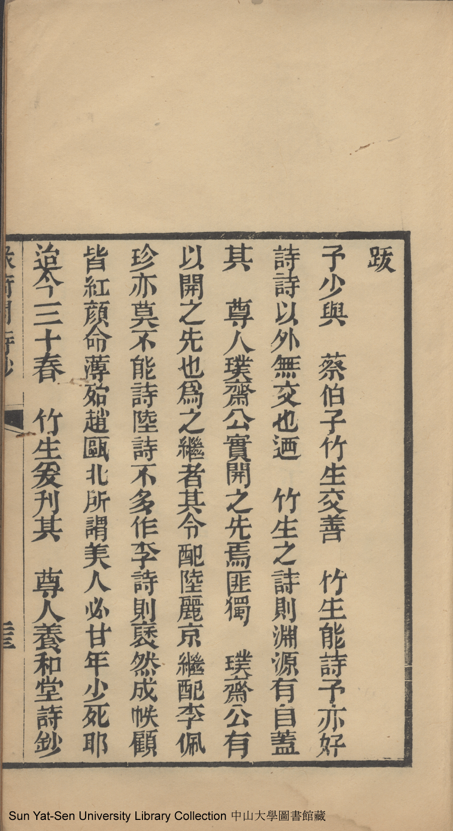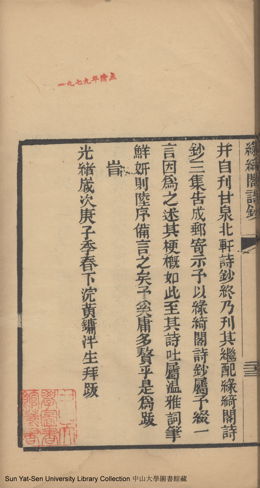 | (PRINT FRIENDLY VERSION) 綠綺閣詩鈔:一卷(清李佩珍撰)。清光緒二十六年(1900)刊本 ![]() 頁碼 : 跋.23b | 点 击 放 大 | 綠綺閣詩鈔:一卷(清李佩珍撰)。清光緒二十六年(1900)刊本![]() 頁碼 : 跋.23a | 点 击 放 大 | 返回 |