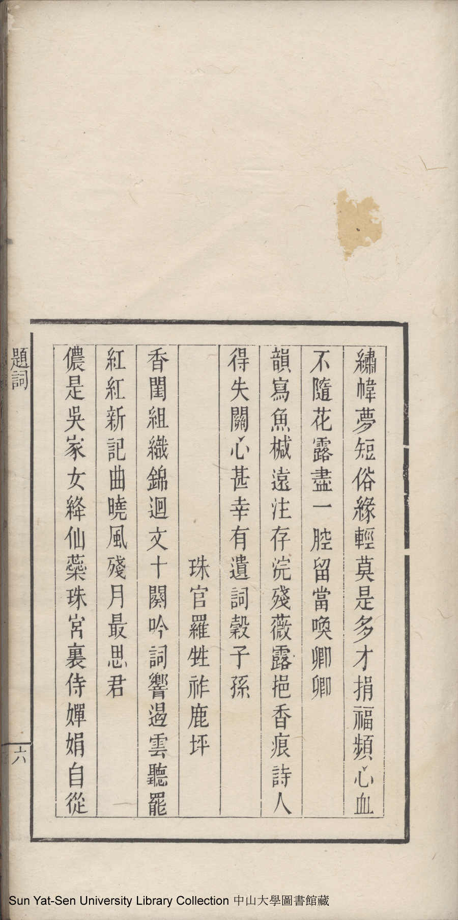 | (PRINT FRIENDLY VERSION) 唾絨餘草:一卷(清吴小姑撰)。同治(1862-1874)刻本 ![]() 頁碼 : 題詞6a | 点 击 放 大 | 唾絨餘草:一卷(清吴小姑撰)。同治(1862-1874)刻本![]() 頁碼 : 題詞5b | 点 击 放 大 | 返回 |