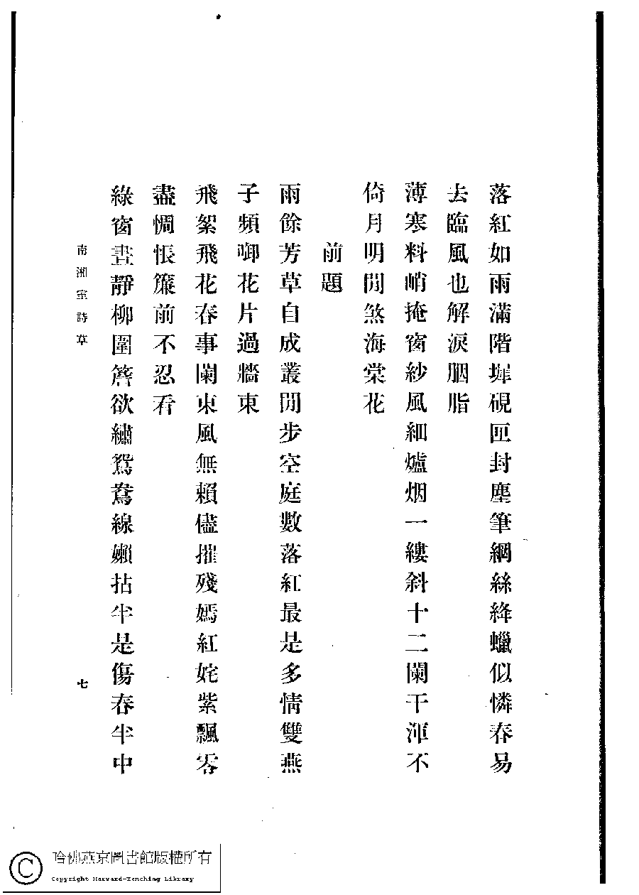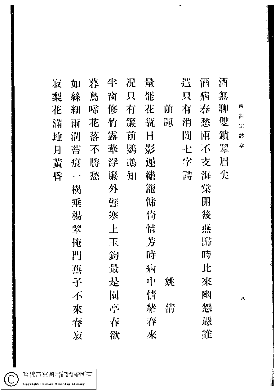 | (PRINT FRIENDLY VERSION) 南湘室詩草﹕一卷﹐詩餘﹕一卷(姚倩、姚茞撰)。1915年日本排印本。 ![]() 頁碼 : 8 | 点 击 放 大 | 南湘室詩草﹕一卷﹐詩餘﹕一卷(姚倩、姚茞撰)。1915年日本排印本。![]() 頁碼 : 7 | 点 击 放 大 | 返回 |