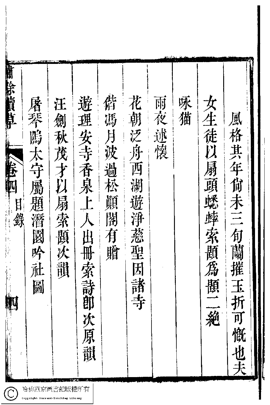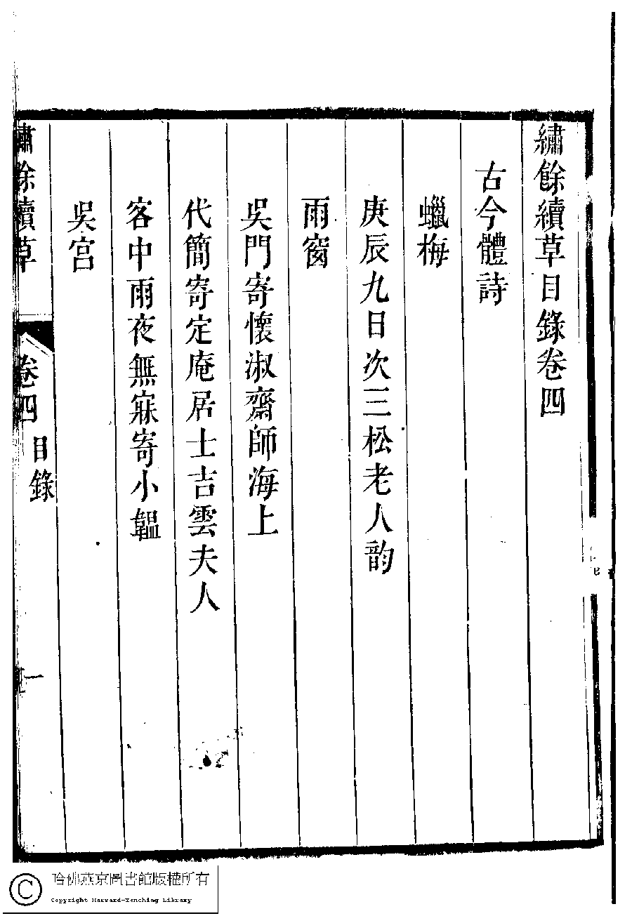 | (PRINT FRIENDLY VERSION) 繡餘續草﹕五卷(清歸懋儀撰) ![]() 頁碼 : 4.目錄.2b | 点 击 放 大 | 繡餘續草﹕五卷(清歸懋儀撰)![]() 頁碼 : 4.目錄.2a | 点 击 放 大 | 繡餘續草﹕五卷(清歸懋儀撰)![]() 頁碼 : 4.目錄.1b | 点 击 放 大 | 繡餘續草﹕五卷(清歸懋儀撰)![]() 頁碼 : 4.目錄.1a | 点 击 放 大 |