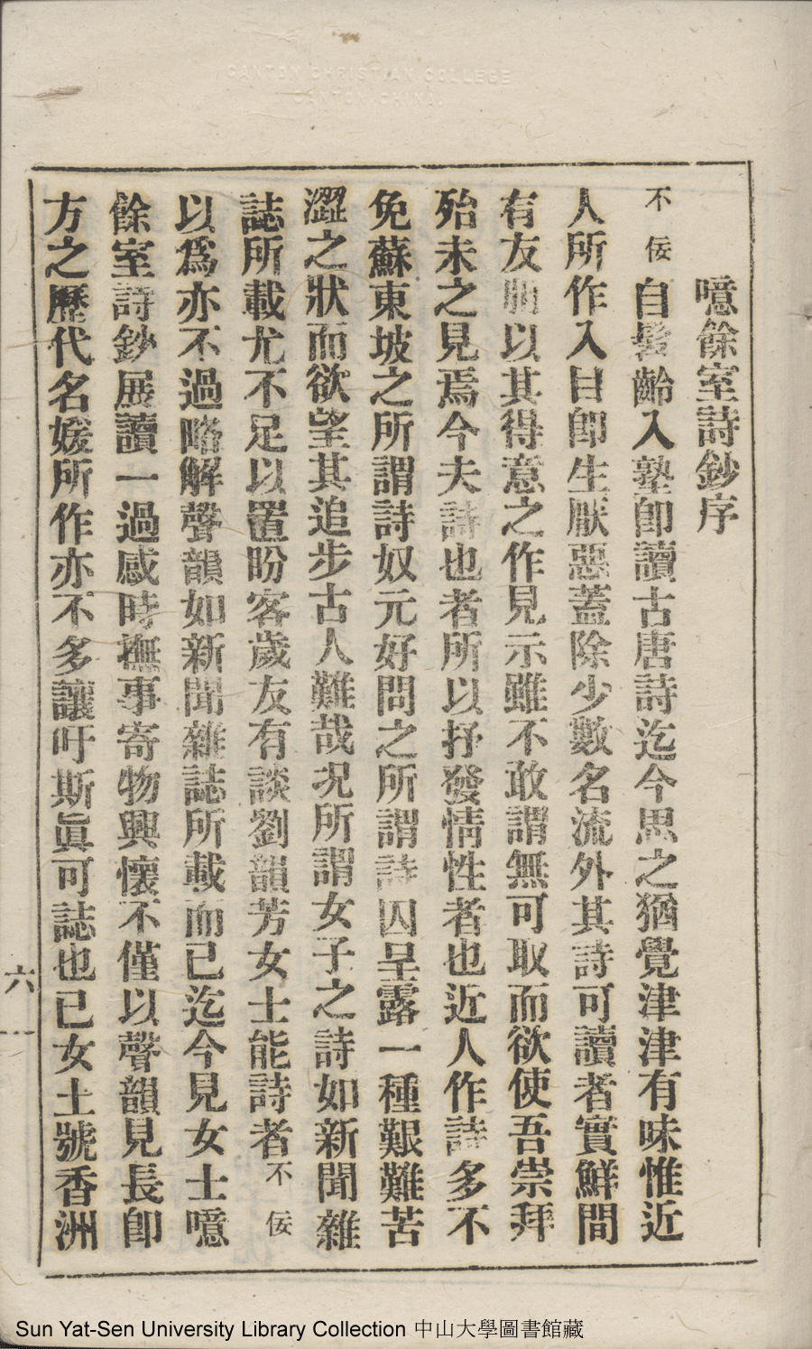 | (PRINT FRIENDLY VERSION) 增訂噫余室詩鈔:一卷(清劉韻芳撰)。民國十一年(1922)鉛印本 ![]() 頁碼 : 序6b | 点 击 放 大 | 增訂噫余室詩鈔:一卷(清劉韻芳撰)。民國十一年(1922)鉛印本![]() 頁碼 : 序6a | 点 击 放 大 | 返回 |