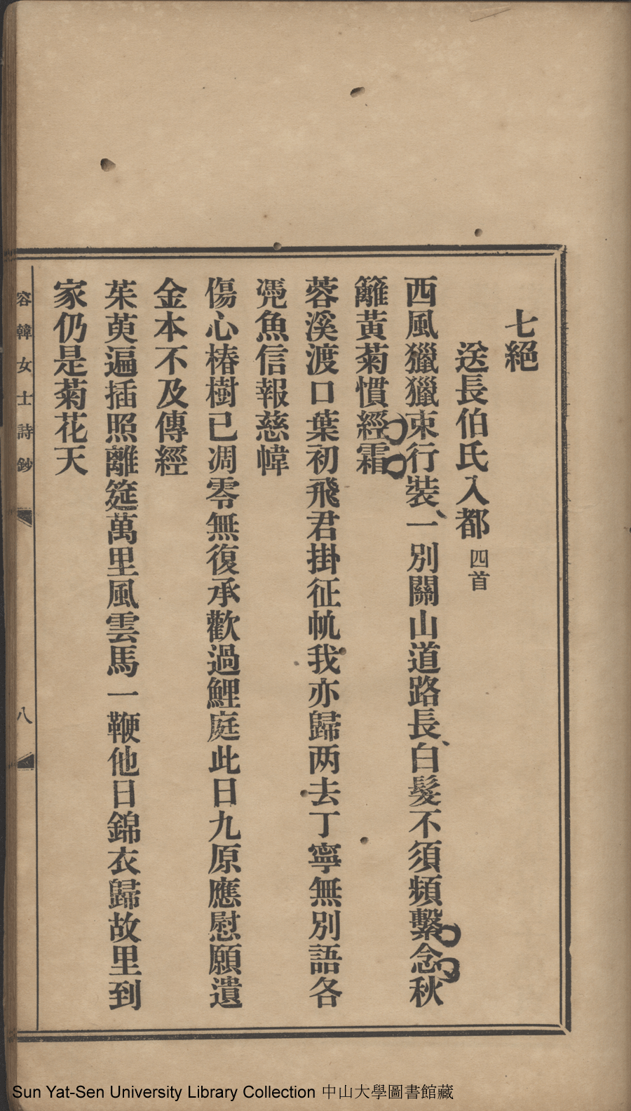 | (PRINT FRIENDLY VERSION) 容韓女士詩鈔:一卷(清韓綺如撰)。一九二七年排印本 ![]() 頁碼 : 詩鈔8a | 点 击 放 大 | 返回 |
