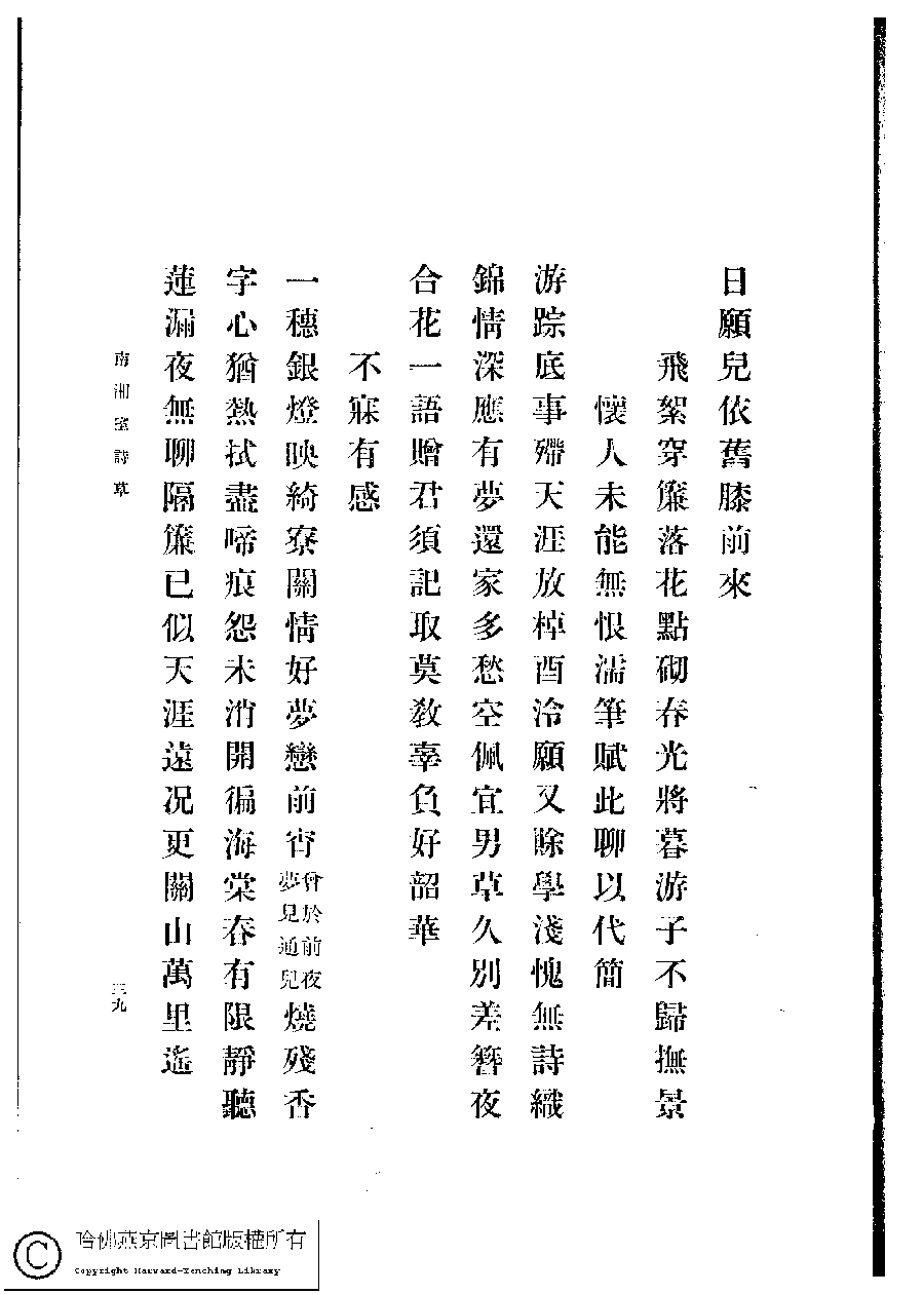 | (PRINT FRIENDLY VERSION) 南湘室詩草﹕一卷﹐詩餘﹕一卷(姚倩、姚茞撰)。1915年日本排印本。 ![]() 頁碼 : 39 | 点 击 放 大 | 返回 |