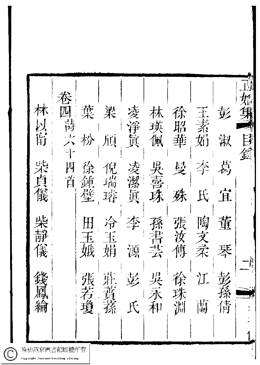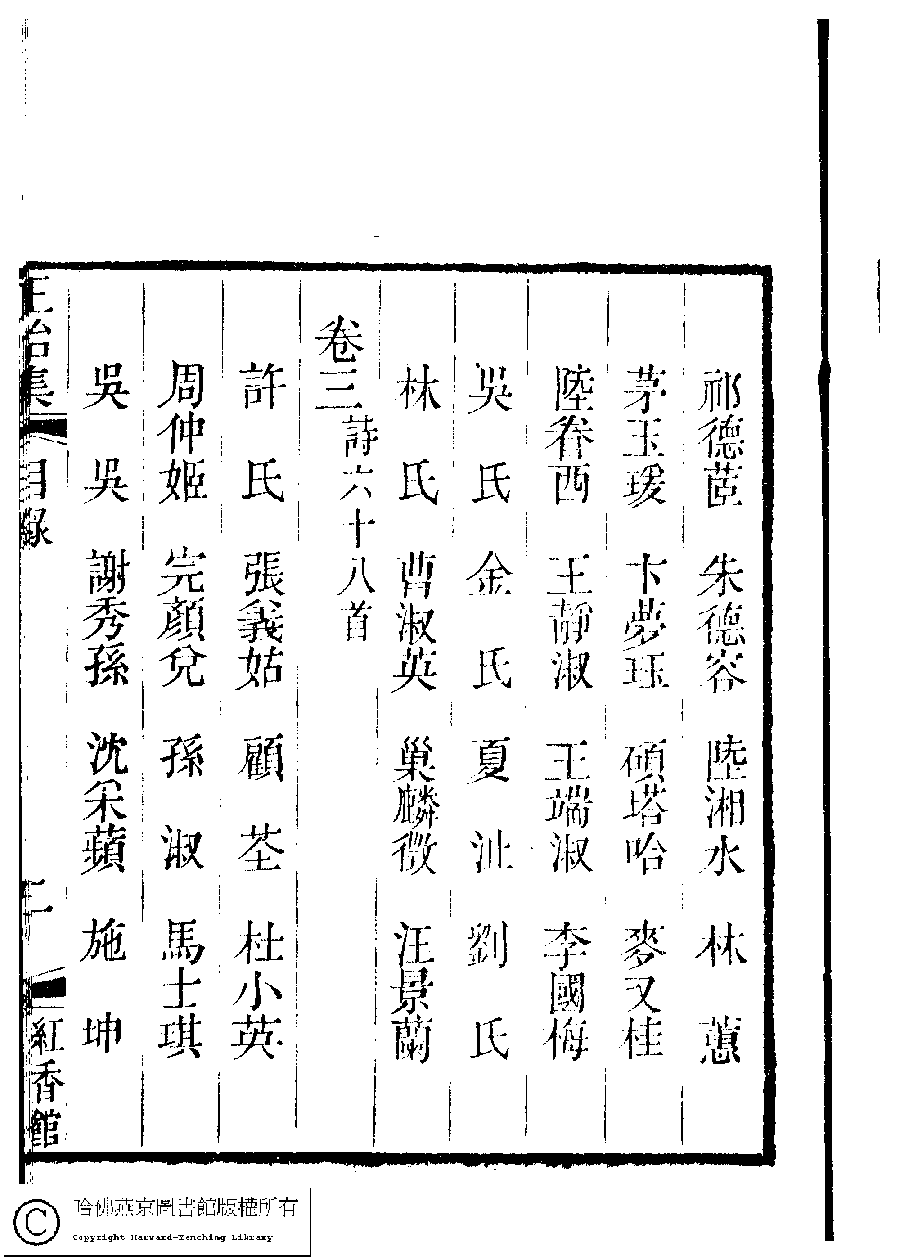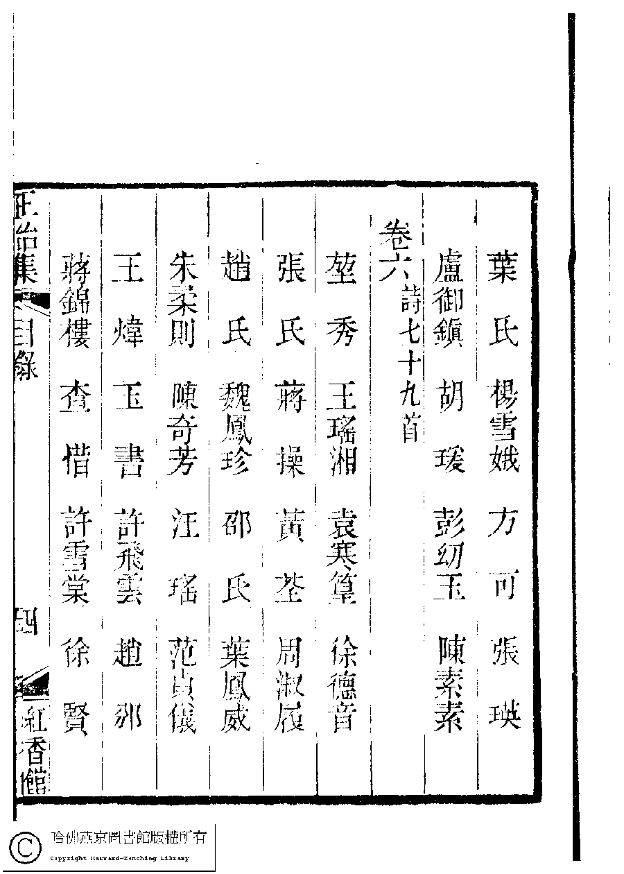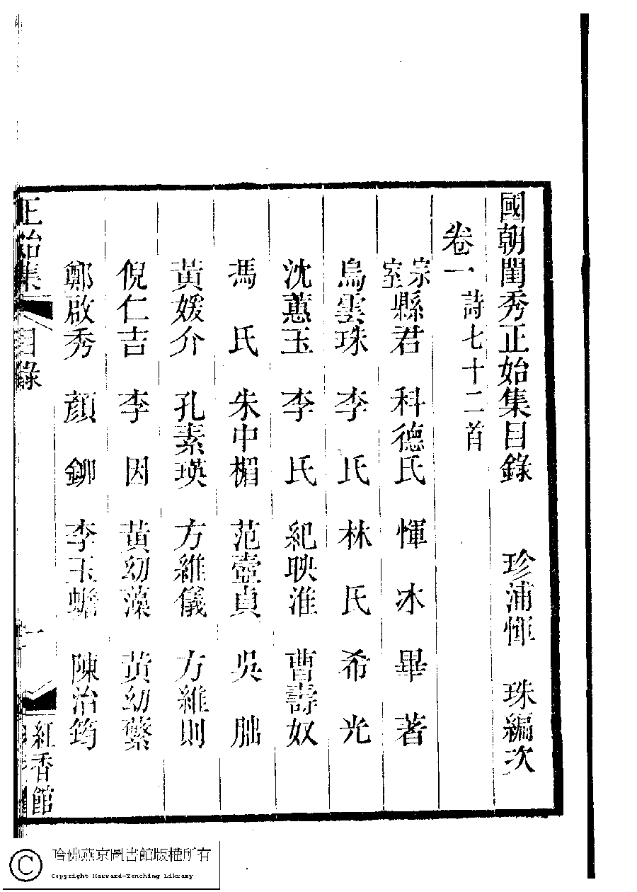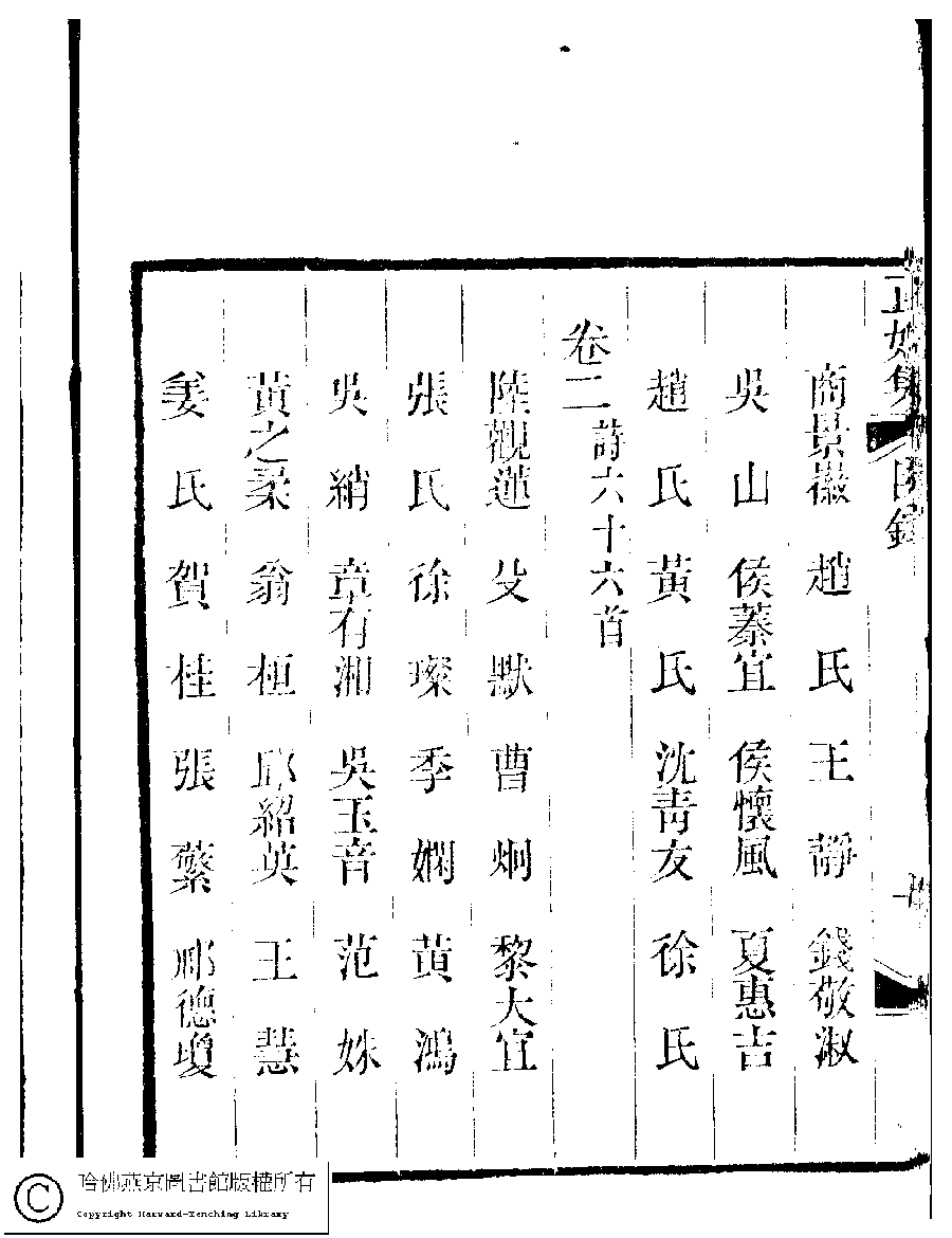 | 原書: 國朝閨秀正始集﹕二十卷﹐附錄﹕一卷﹐補遺﹕一卷﹐又附題詞﹕一卷(清惲珠輯) |