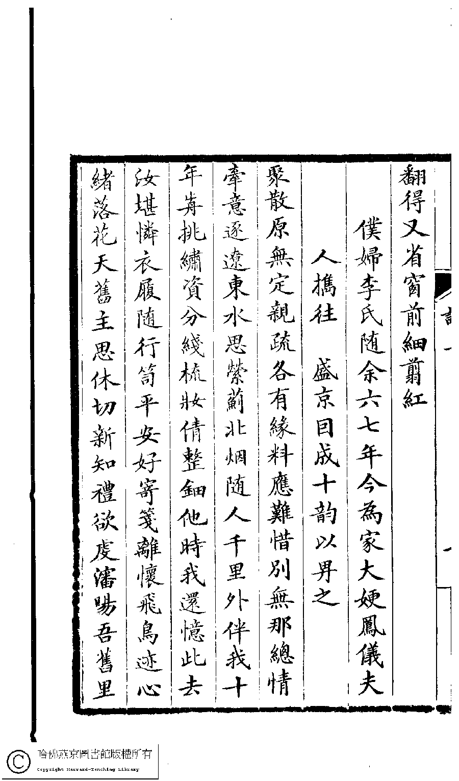 詩詞 [僕婦李氏隨余六七年今為家大嫂鳳儀夫人攜往盛京因成十韵以畀之]