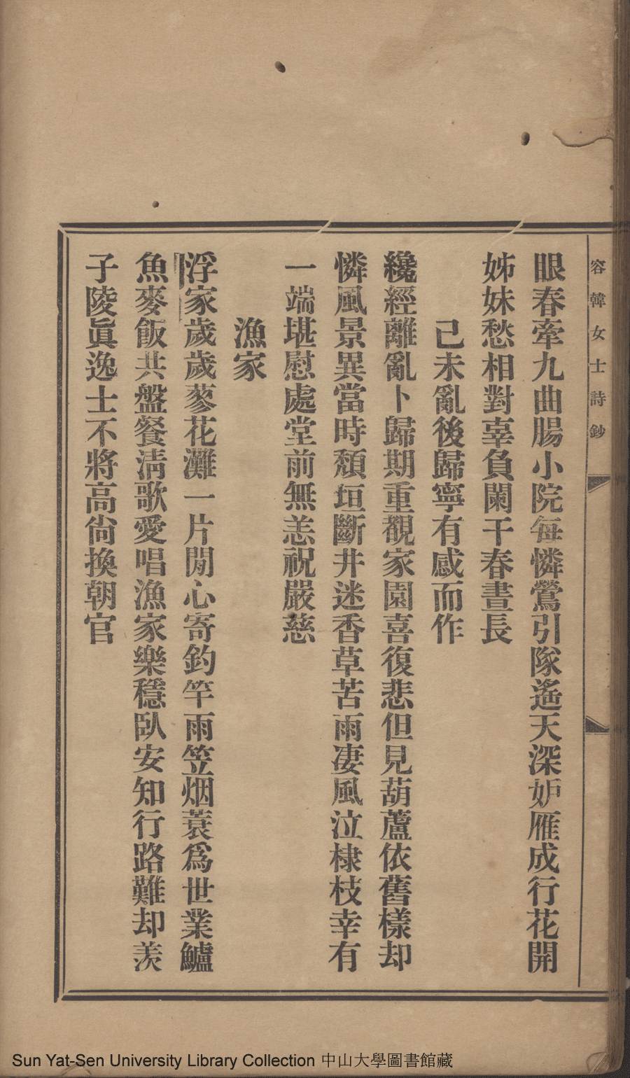| (PRINT FRIENDLY VERSION) 容韓女士詩鈔:一卷(清韓綺如撰)。一九二七年排印本 ![]() 頁碼 : 詩鈔38b | 点 击 放 大 | 返回 |