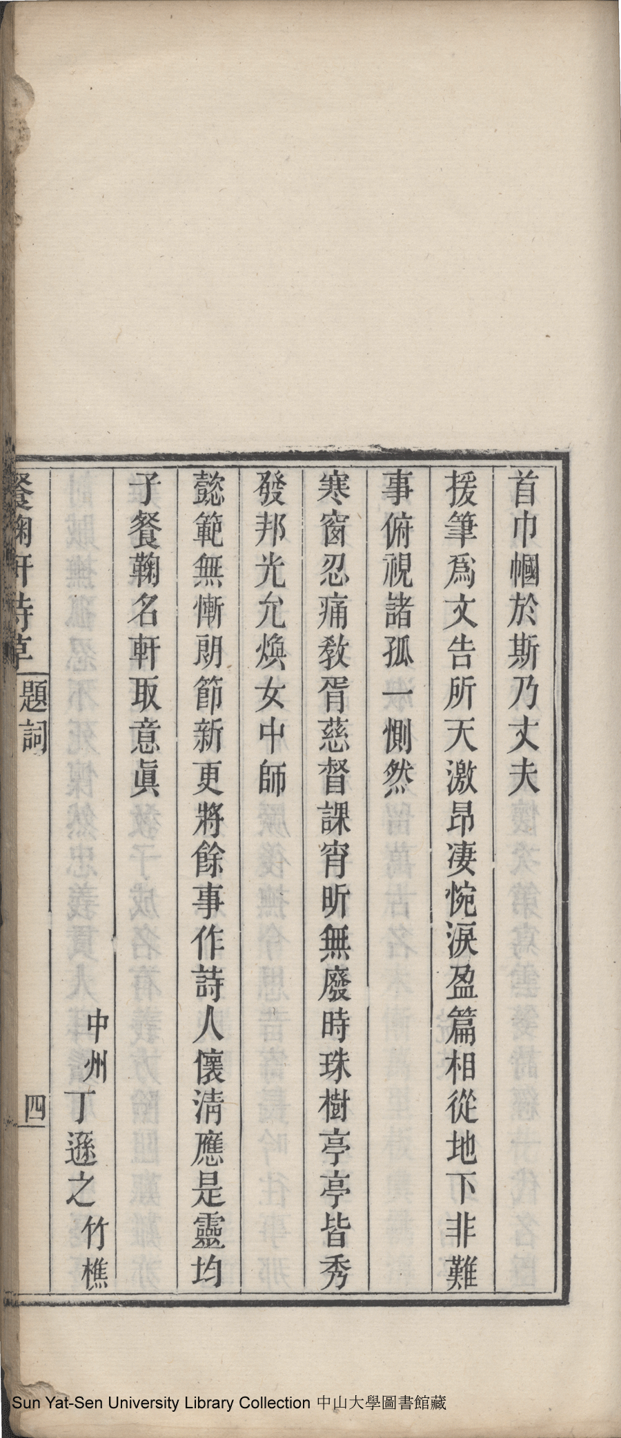 | (PRINT FRIENDLY VERSION) 餐菊軒詩草: 一卷(清伍淡如撰)。光緒十四年戊子(1888)重刊本 ![]() 頁碼 : 題詞4a | 点 击 放 大 | 餐菊軒詩草: 一卷(清伍淡如撰)。光緒十四年戊子(1888)重刊本![]() 頁碼 : 題詞3b | 点 击 放 大 | 返回 |