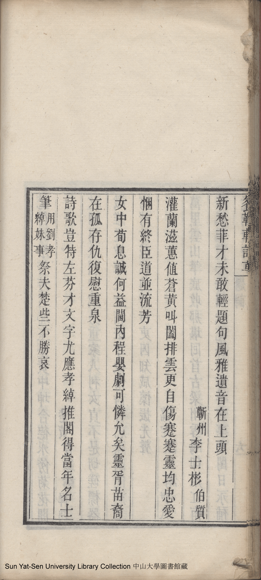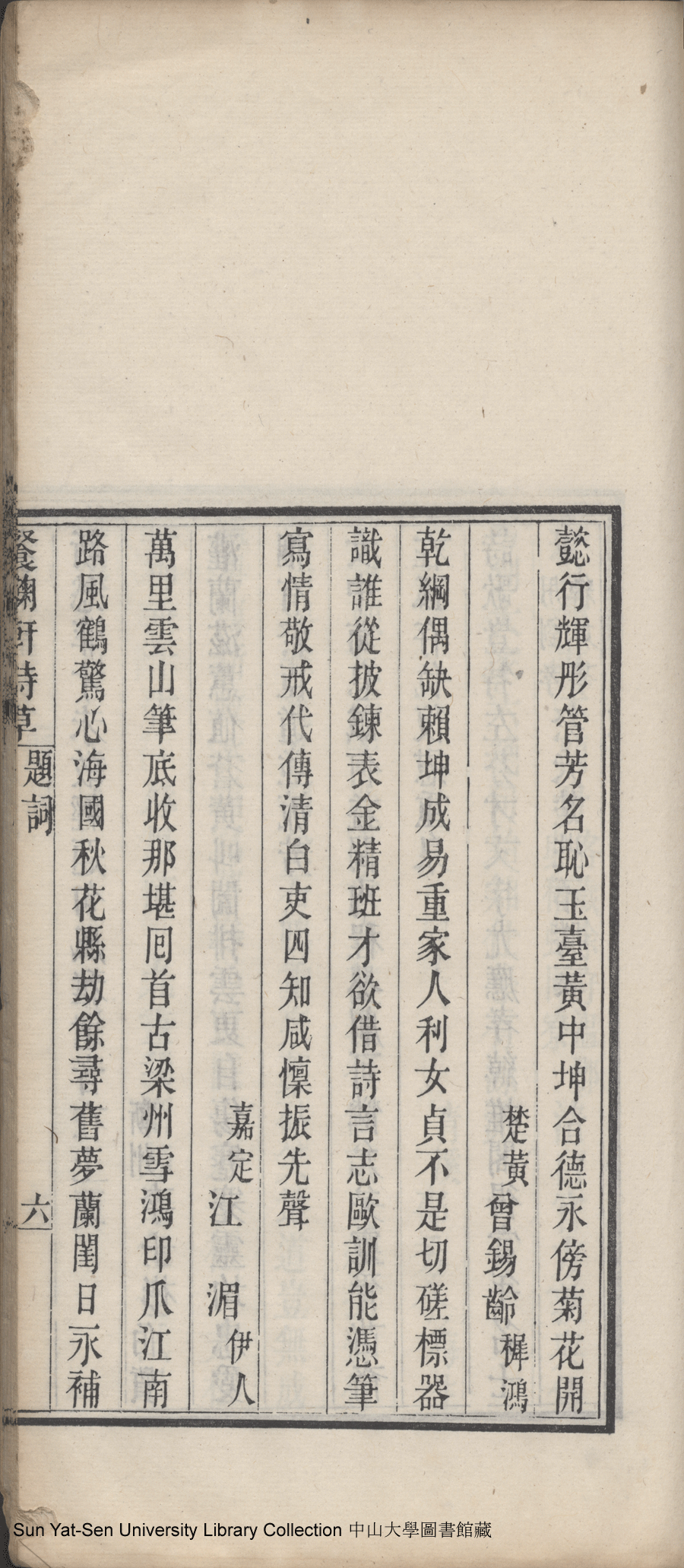 | (PRINT FRIENDLY VERSION) 餐菊軒詩草: 一卷(清伍淡如撰)。光緒十四年戊子(1888)重刊本 ![]() 頁碼 : 題詞6b | 点 击 放 大 | 餐菊軒詩草: 一卷(清伍淡如撰)。光緒十四年戊子(1888)重刊本![]() 頁碼 : 題詞6a | 点 击 放 大 | 返回 |