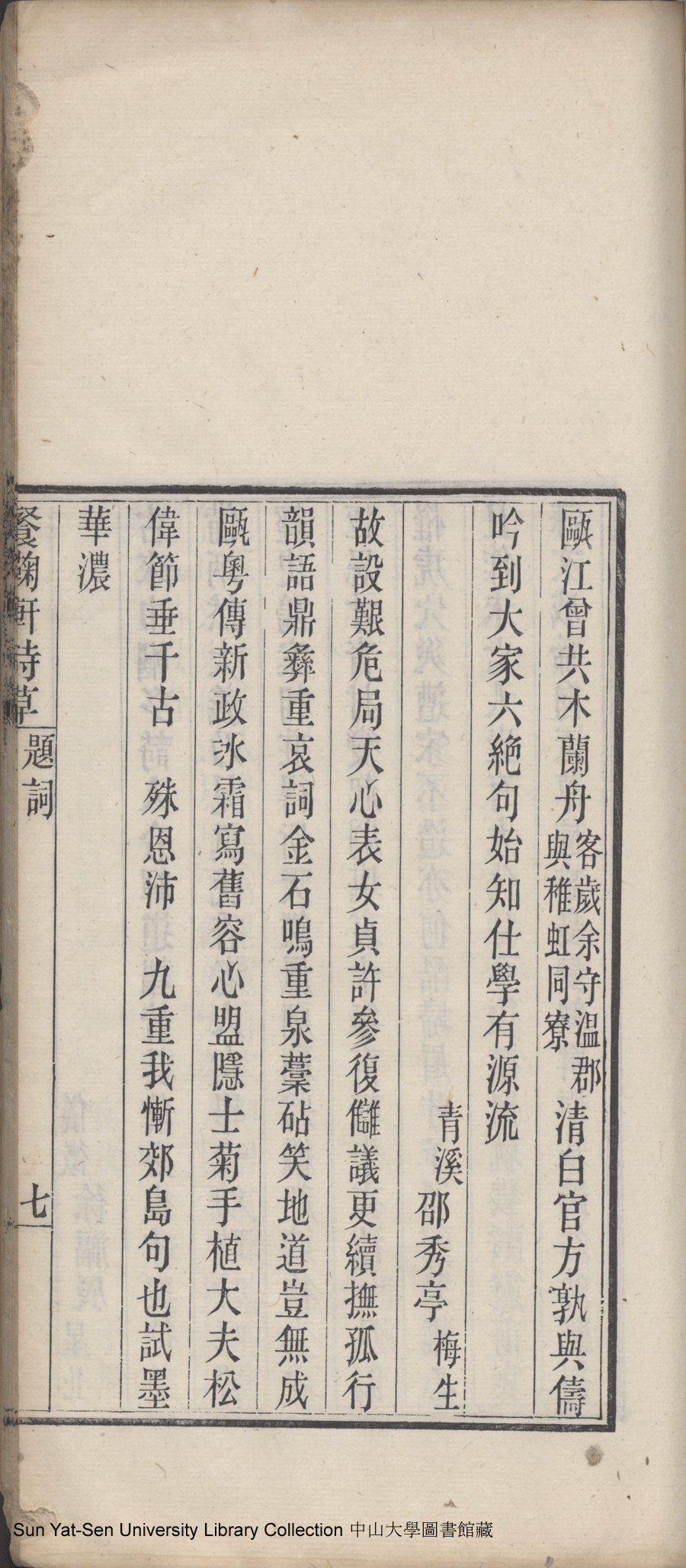 | (PRINT FRIENDLY VERSION) 餐菊軒詩草: 一卷(清伍淡如撰)。光緒十四年戊子(1888)重刊本 ![]() 頁碼 : 題詞7a | 点 击 放 大 | 返回 |