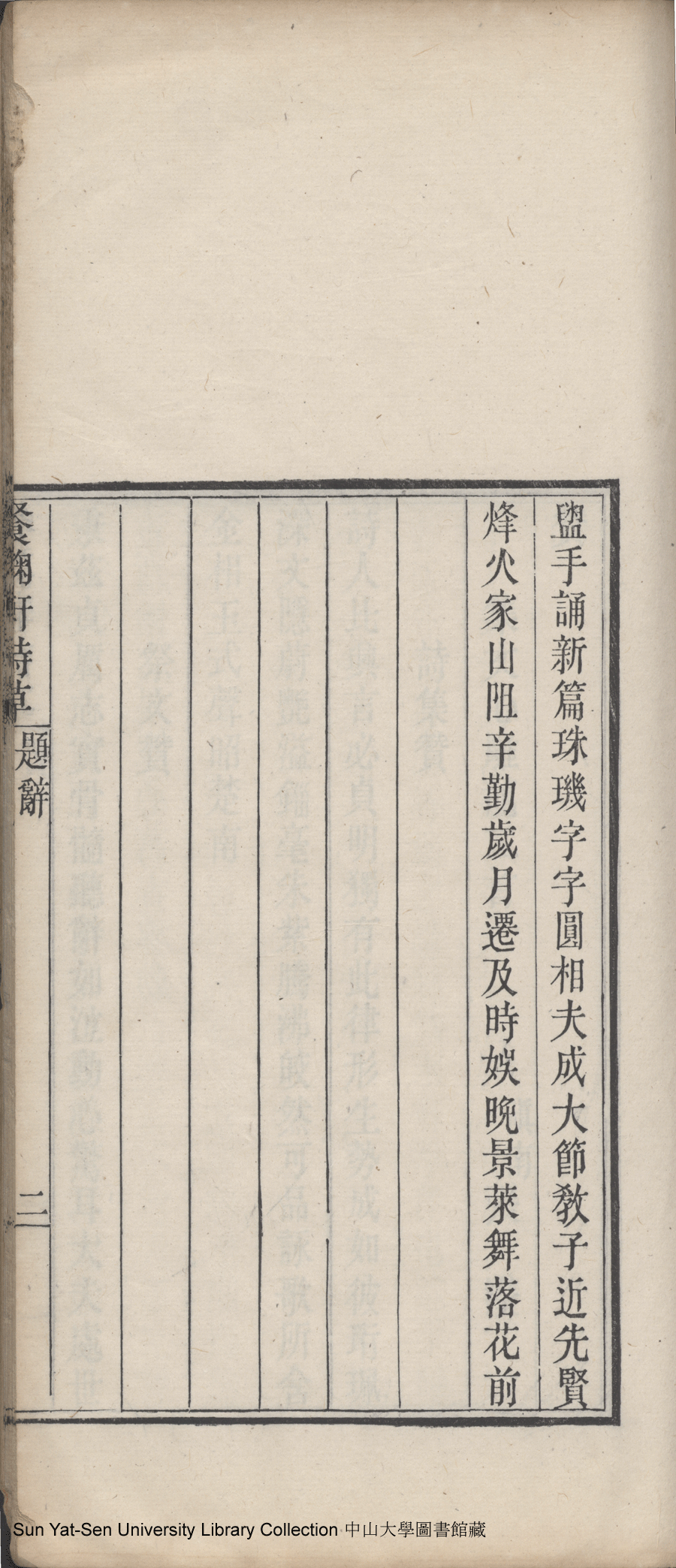 | (PRINT FRIENDLY VERSION) 餐菊軒詩草: 一卷(清伍淡如撰)。光緒十四年戊子(1888)重刊本 ![]() 頁碼 : 題辭2b | 点 击 放 大 | 餐菊軒詩草: 一卷(清伍淡如撰)。光緒十四年戊子(1888)重刊本![]() 頁碼 : 題辭2a | 点 击 放 大 | 餐菊軒詩草: 一卷(清伍淡如撰)。光緒十四年戊子(1888)重刊本![]() 頁碼 : 題辭1b | 点 击 放 大 | 返回 |