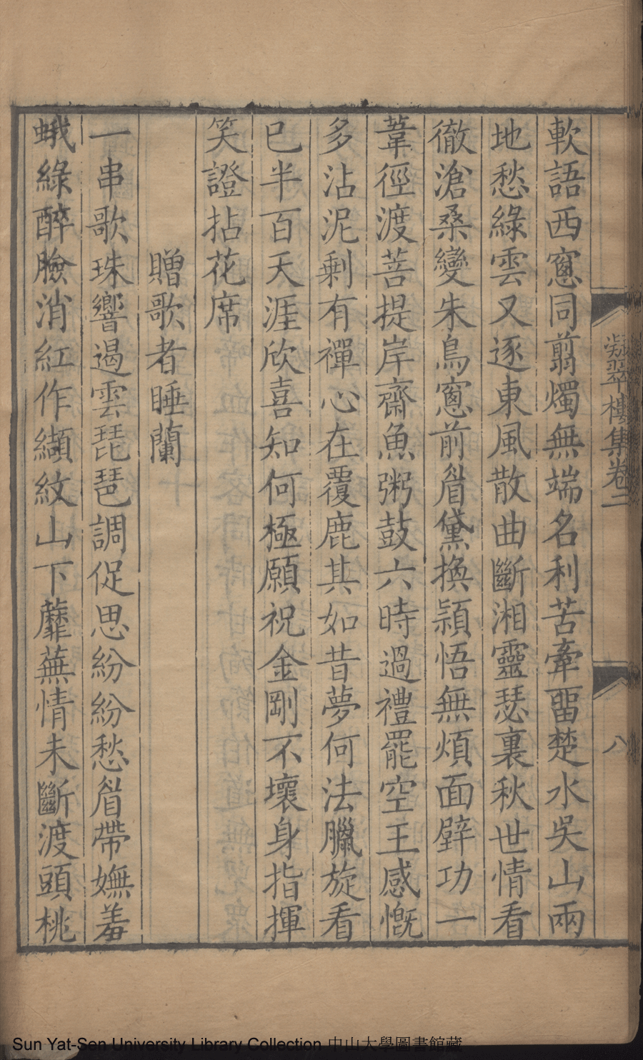 | (PRINT FRIENDLY VERSION) 凝翠樓集:四卷(清王慧撰)。康熙四十七年戊子(1708)朱氏銀槎閣精刊本 ![]() 頁碼 : 卷二8b | 点 击 放 大 | 凝翠樓集:四卷(清王慧撰)。康熙四十七年戊子(1708)朱氏銀槎閣精刊本![]() 頁碼 : 卷二8a | 点 击 放 大 | 返回 |