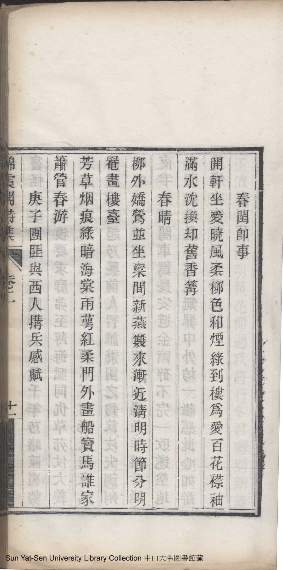 | (PRINT FRIENDLY VERSION) 錦霞閣詩集:五卷,詞集:一卷(清包蘭瑛撰)。宣統二年庚戌(1910)刊本 ![]() 頁碼 : 卷二11a | 点 击 放 大 | 返回 |