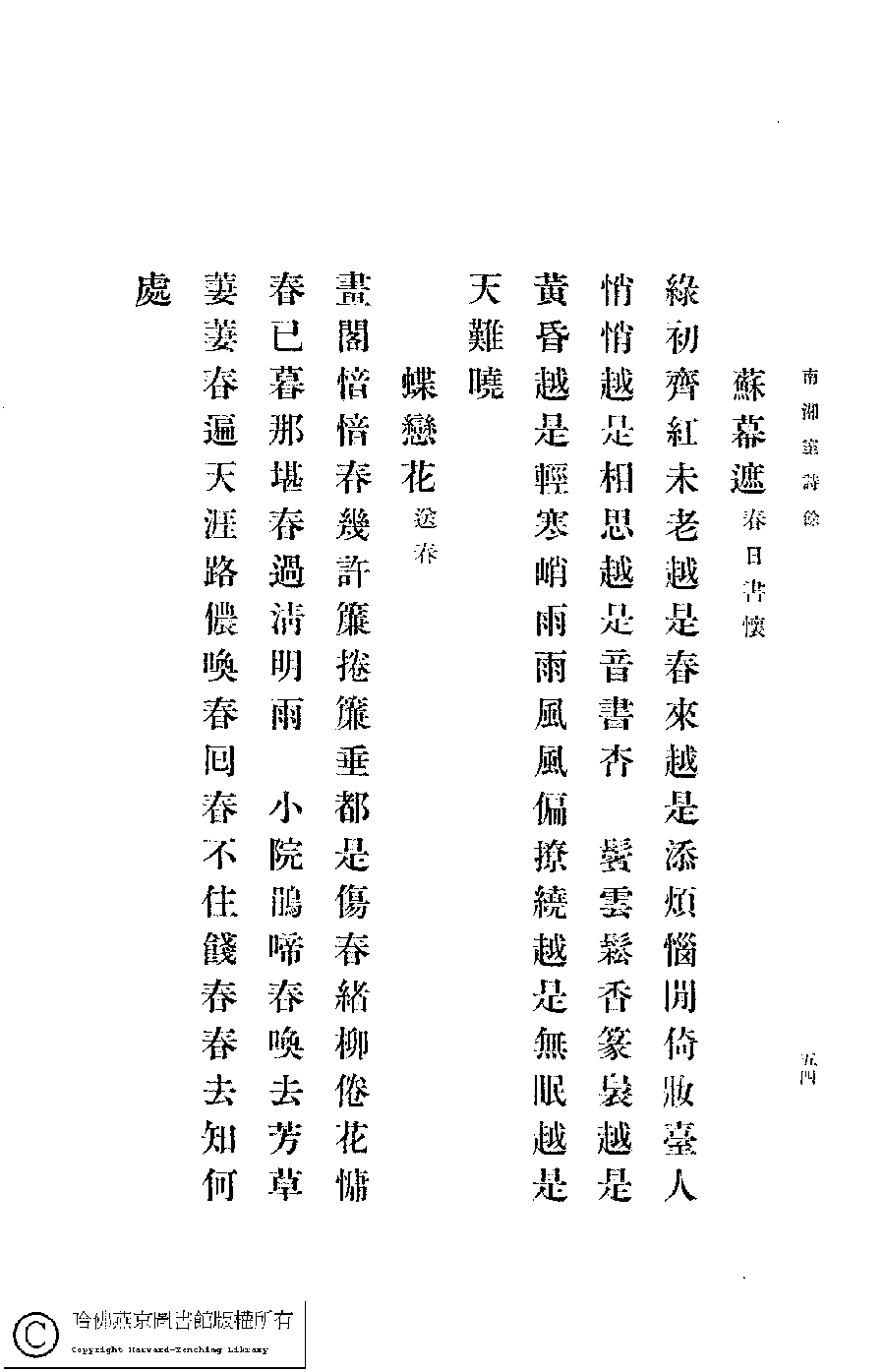 | (PRINT FRIENDLY VERSION) 南湘室詩草﹕一卷﹐詩餘﹕一卷(姚倩、姚茞撰)。1915年日本排印本。 ![]() 頁碼 : 54 | 点 击 放 大 | 返回 |