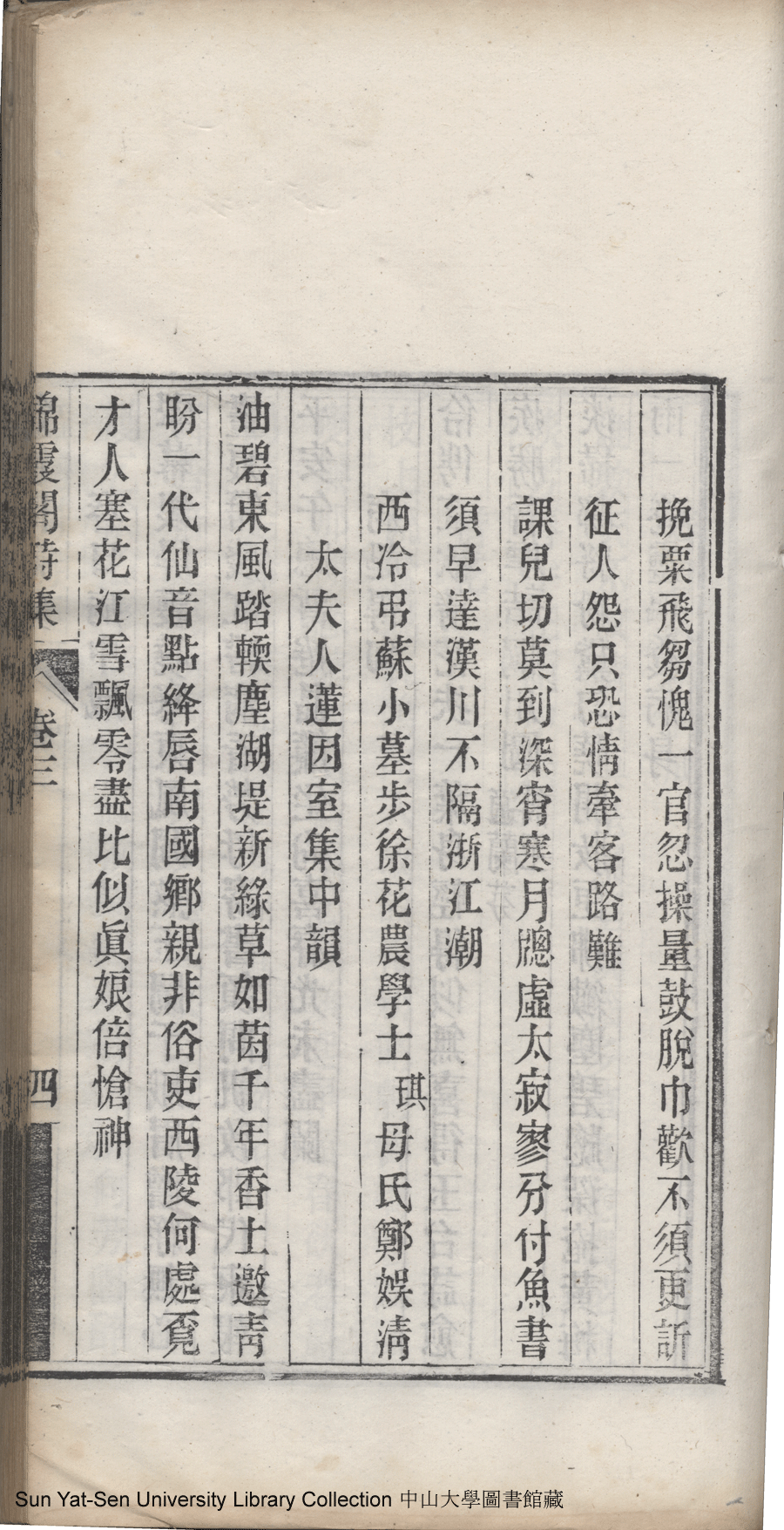 | (PRINT FRIENDLY VERSION) 錦霞閣詩集:五卷,詞集:一卷(清包蘭瑛撰)。宣統二年庚戌(1910)刊本 ![]() 頁碼 : 卷三4a | 点 击 放 大 | 返回 |