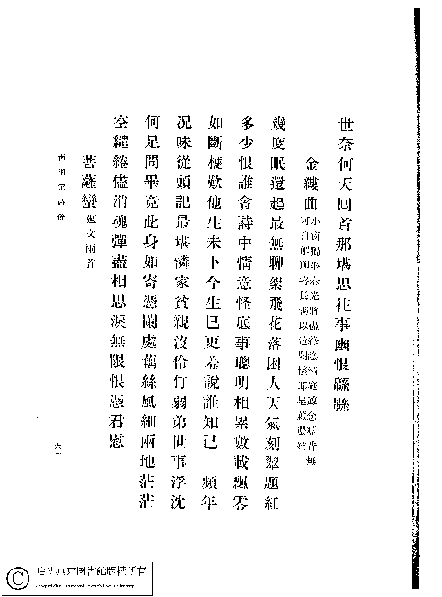 | (PRINT FRIENDLY VERSION) 南湘室詩草﹕一卷﹐詩餘﹕一卷(姚倩、姚茞撰)。1915年日本排印本。 ![]() 頁碼 : 61 | 点 击 放 大 | 返回 |