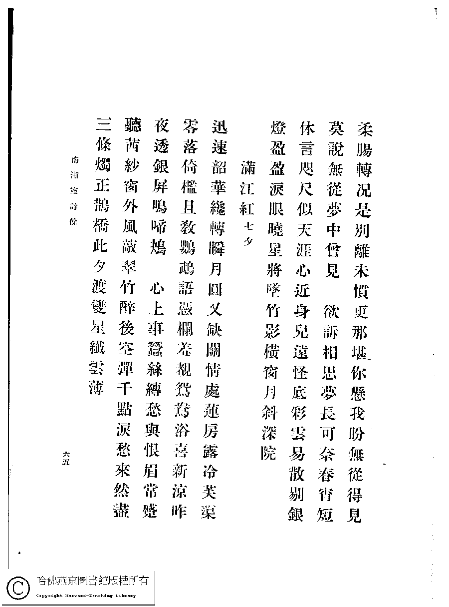 | (PRINT FRIENDLY VERSION) 南湘室詩草﹕一卷﹐詩餘﹕一卷(姚倩、姚茞撰)。1915年日本排印本。 ![]() 頁碼 : 65 | 点 击 放 大 | 返回 |