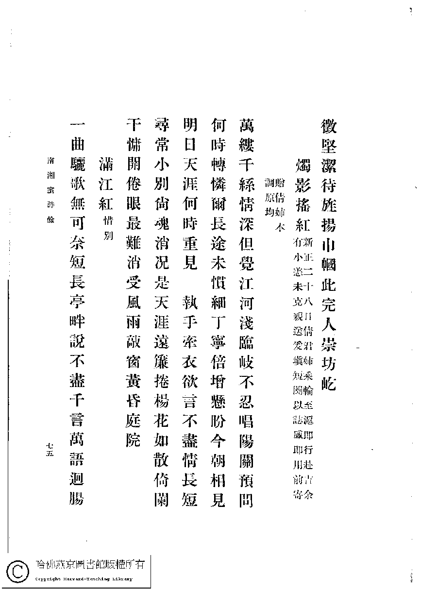 | (PRINT FRIENDLY VERSION) 南湘室詩草﹕一卷﹐詩餘﹕一卷(姚倩、姚茞撰)。1915年日本排印本。 ![]() 頁碼 : 75 | 点 击 放 大 | 返回 |