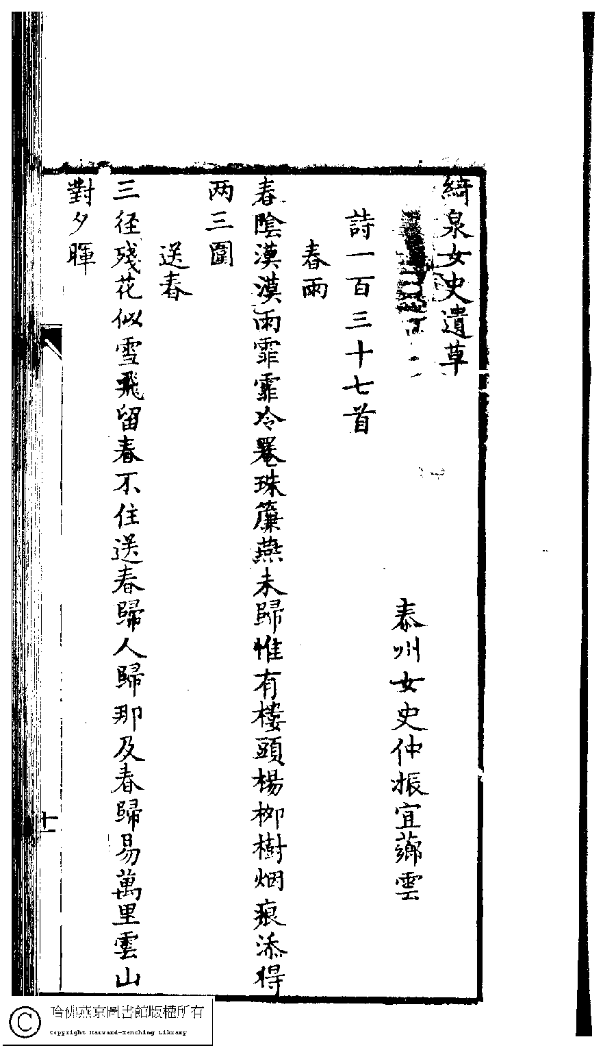 | 原書: 泰州仲氏閨秀集合刻﹕七種(清仲蓮慶等撰): 綺泉女史遺草﹕一卷 |