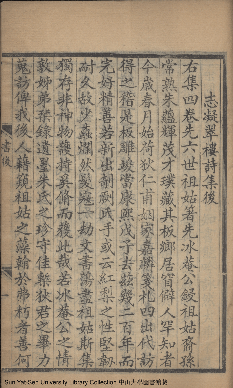 | (PRINT FRIENDLY VERSION) 凝翠樓集:四卷(清王慧撰)。康熙四十七年戊子(1708)朱氏銀槎閣精刊本 ![]() 頁碼 : 侄孫壽慈書後1b | 点 击 放 大 | 凝翠樓集:四卷(清王慧撰)。康熙四十七年戊子(1708)朱氏銀槎閣精刊本![]() 頁碼 : 侄孫壽慈書後1a | 点 击 放 大 | 返回 |