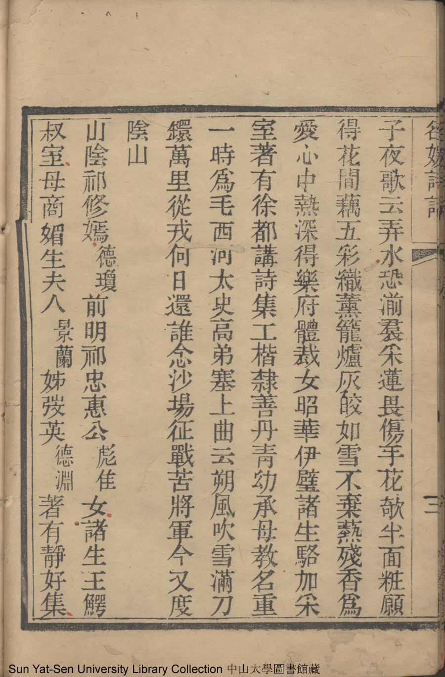 | (PRINT FRIENDLY VERSION) 名媛詩話十二卷續集三卷: 十五卷(清沈善寶撰)。清光緒五年(1879)鴻雪樓刻巾箱本 ![]() 頁碼 : 卷一3b | 点 击 放 大 | 名媛詩話十二卷續集三卷: 十五卷(清沈善寶撰)。清光緒五年(1879)鴻雪樓刻巾箱本![]() 頁碼 : 卷一3a | 点 击 放 大 | 返回 |