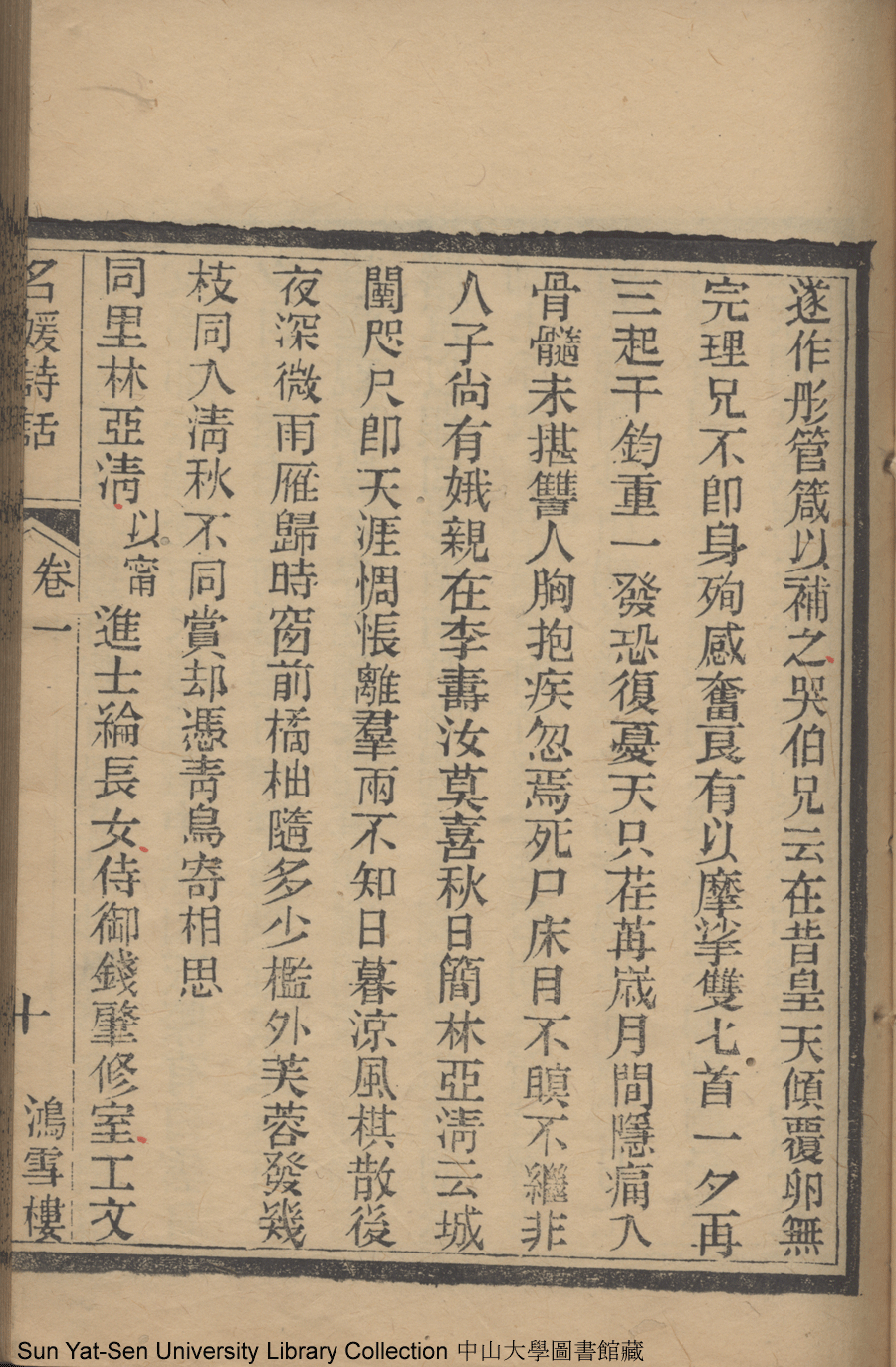 | (PRINT FRIENDLY VERSION) 名媛詩話十二卷續集三卷: 十五卷(清沈善寶撰)。清光緒五年(1879)鴻雪樓刻巾箱本 ![]() 頁碼 : 卷一10a | 点 击 放 大 | 名媛詩話十二卷續集三卷: 十五卷(清沈善寶撰)。清光緒五年(1879)鴻雪樓刻巾箱本![]() 頁碼 : 卷一9b | 点 击 放 大 | 返回 |
