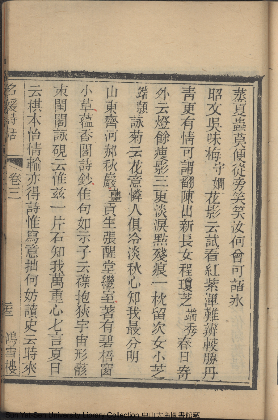 | (PRINT FRIENDLY VERSION) 名媛詩話十二卷續集三卷: 十五卷(清沈善寶撰)。清光緒五年(1879)鴻雪樓刻巾箱本 ![]() 頁碼 : 卷三23b | 点 击 放 大 | 名媛詩話十二卷續集三卷: 十五卷(清沈善寶撰)。清光緒五年(1879)鴻雪樓刻巾箱本![]() 頁碼 : 卷三23a | 点 击 放 大 | 返回 |