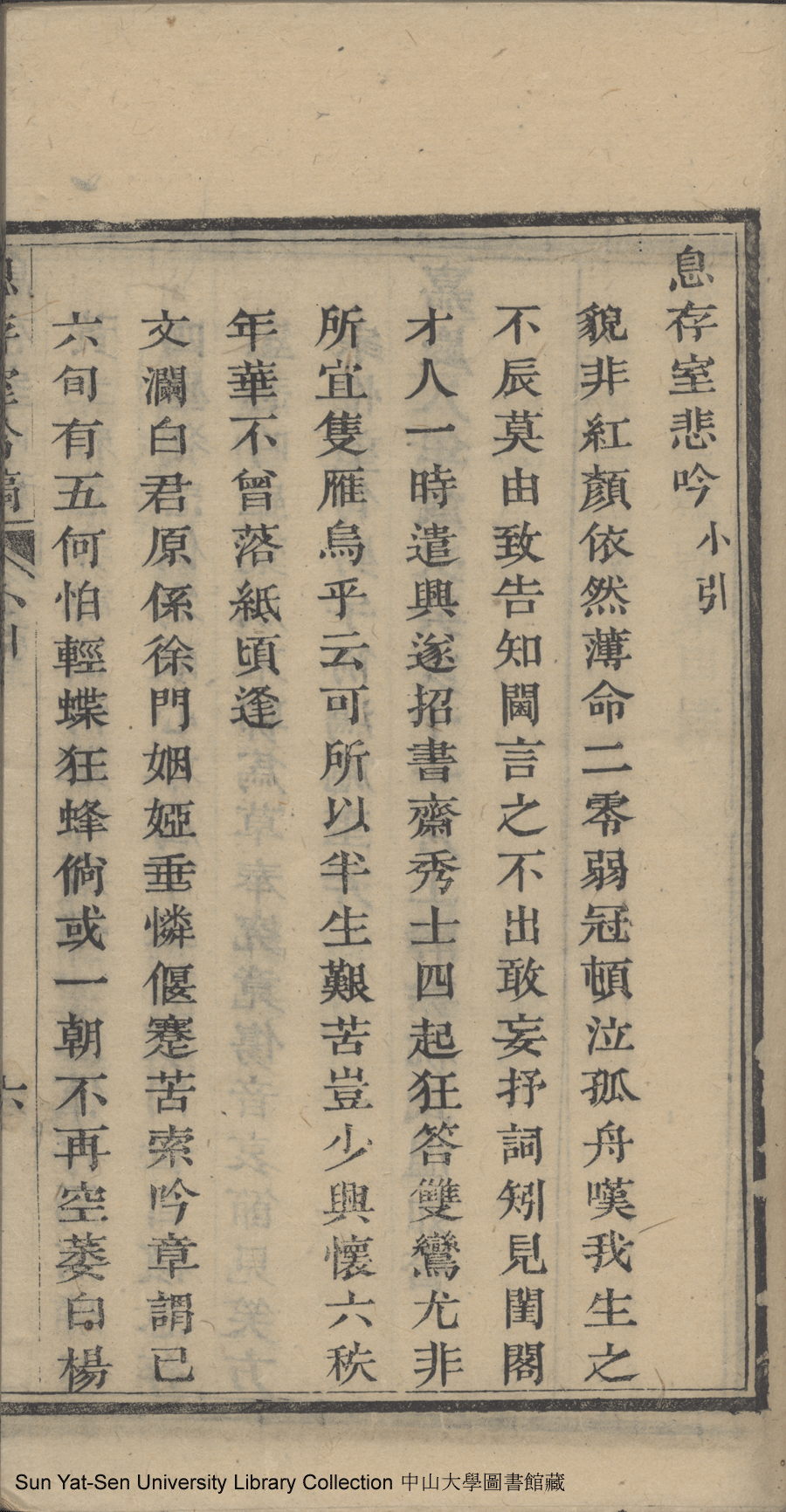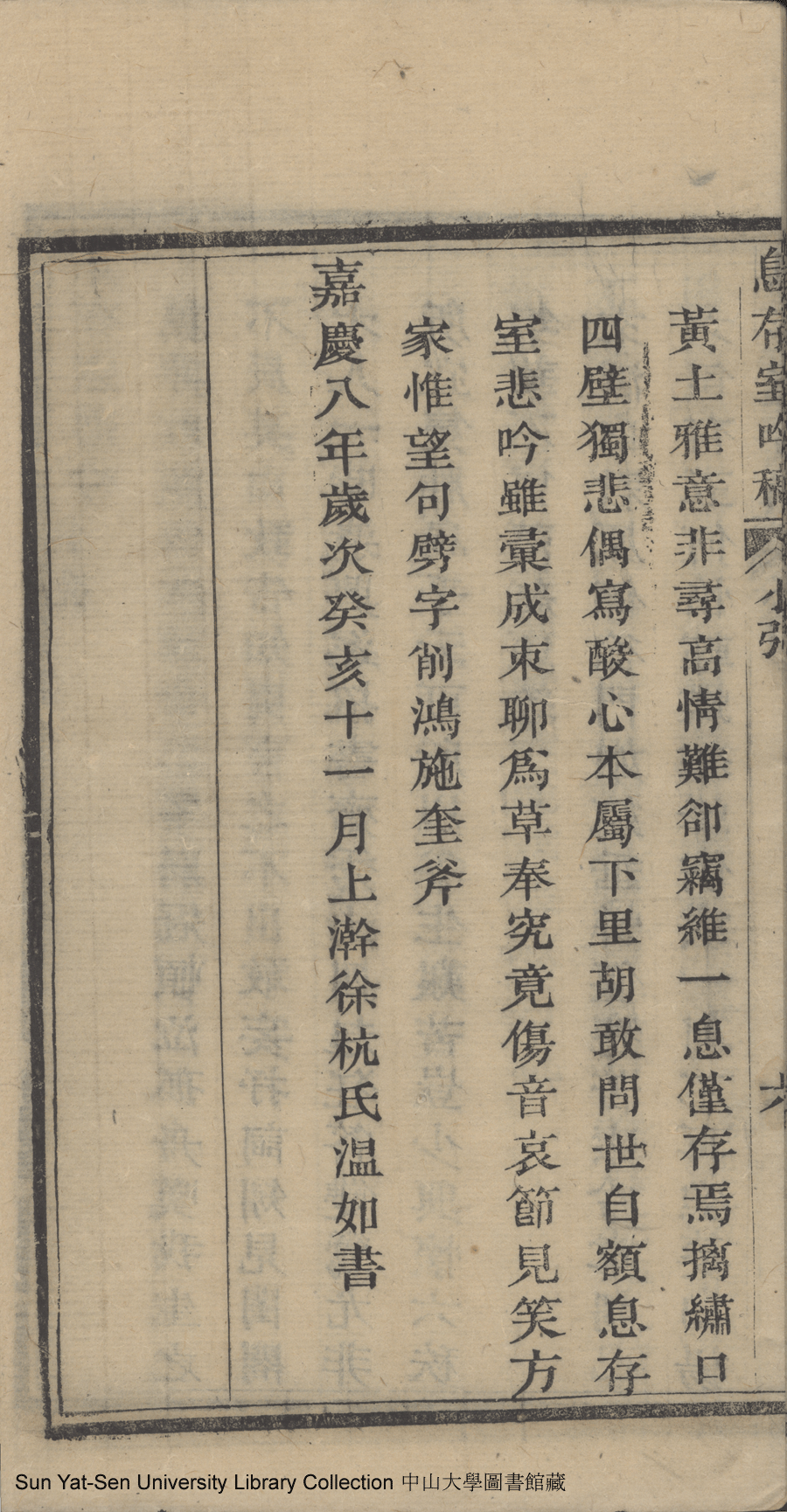 | (PRINT FRIENDLY VERSION) 息存室吟稿初集一卷續集一卷:二卷(清杭溫如撰)。清嘉慶十三年戊辰(1808)原刻續集嘉慶二十二年丁丑(1817)刻光緒三十四年(1908)重梓 ![]() 頁碼 : 小引1b | 点 击 放 大 | 息存室吟稿初集一卷續集一卷:二卷(清杭溫如撰)。清嘉慶十三年戊辰(1808)原刻續集嘉慶二十二年丁丑(1817)刻光緒三十四年(1908)重梓![]() 頁碼 : 小引1a | 点 击 放 大 | 返回 |