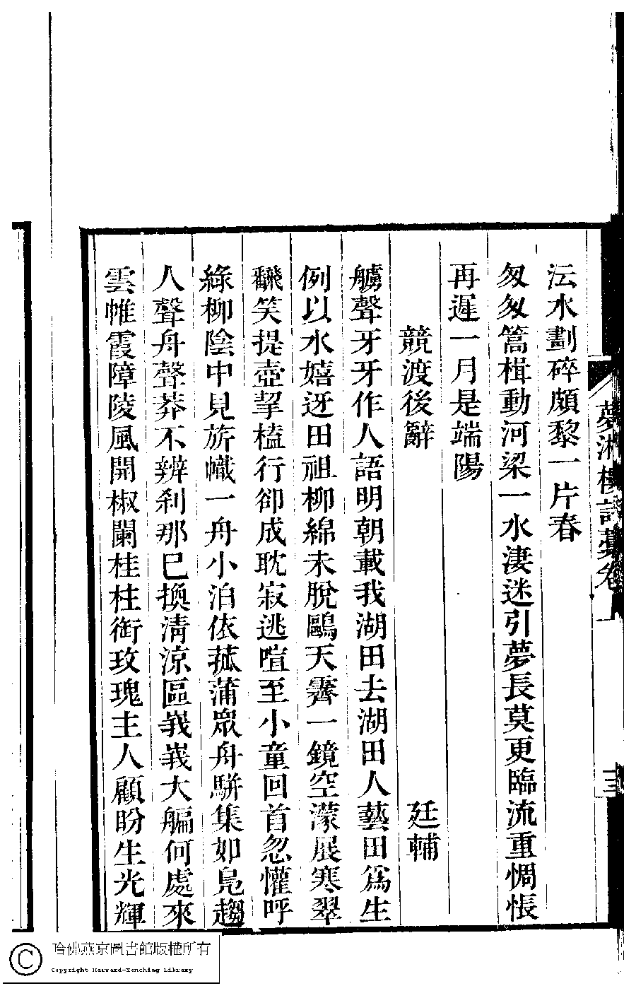 | (PRINT FRIENDLY VERSION) 夢湘樓詩稿﹕二卷﹐詞稿﹕一卷﹔繭香館吟艸﹕一卷﹐繡餘詞草﹕一卷(清宗婉等撰) : 夢湘樓詩稿﹕二卷﹐詞稿﹕一卷。清光緒六年(1880)常熟宗氏刻本 ![]() 頁碼 : 上.14a | 点 击 放 大 | 夢湘樓詩稿﹕二卷﹐詞稿﹕一卷﹔繭香館吟艸﹕一卷﹐繡餘詞草﹕一卷(清宗婉等撰) : 夢湘樓詩稿﹕二卷﹐詞稿﹕一卷。清光緒六年(1880)常熟宗氏刻本![]() 頁碼 : 上.13b | 点 击 放 大 | 返回 |