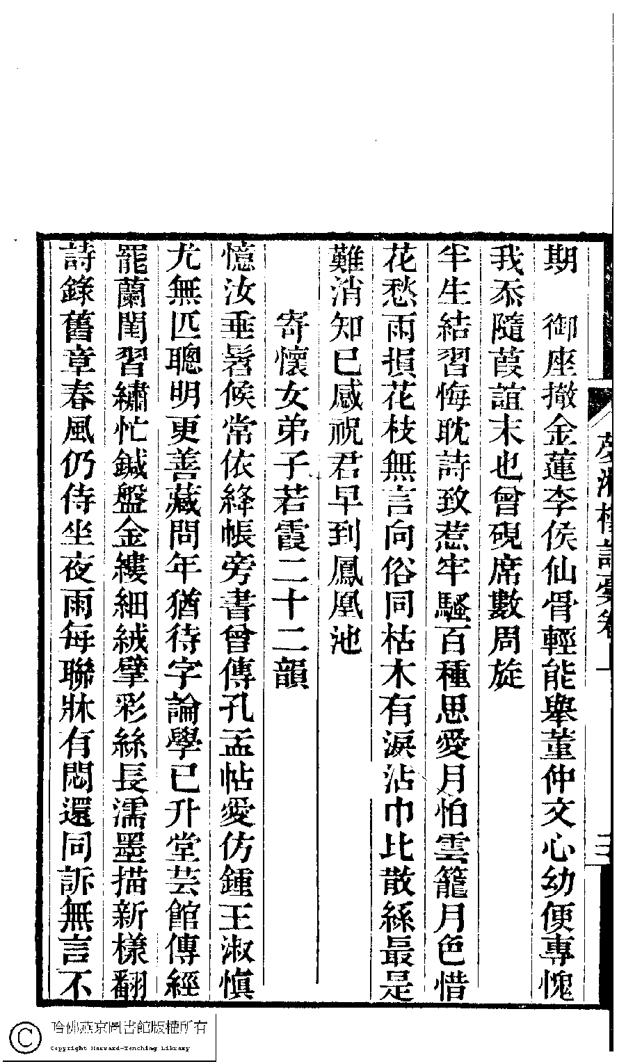 | (PRINT FRIENDLY VERSION) 夢湘樓詩稿﹕二卷﹐詞稿﹕一卷﹔繭香館吟艸﹕一卷﹐繡餘詞草﹕一卷(清宗婉等撰) : 夢湘樓詩稿﹕二卷﹐詞稿﹕一卷。清光緒六年(1880)常熟宗氏刻本 ![]() 頁碼 : 上.21a | 点 击 放 大 | 夢湘樓詩稿﹕二卷﹐詞稿﹕一卷﹔繭香館吟艸﹕一卷﹐繡餘詞草﹕一卷(清宗婉等撰) : 夢湘樓詩稿﹕二卷﹐詞稿﹕一卷。清光緒六年(1880)常熟宗氏刻本![]() 頁碼 : 上.20b | 点 击 放 大 | 返回 |