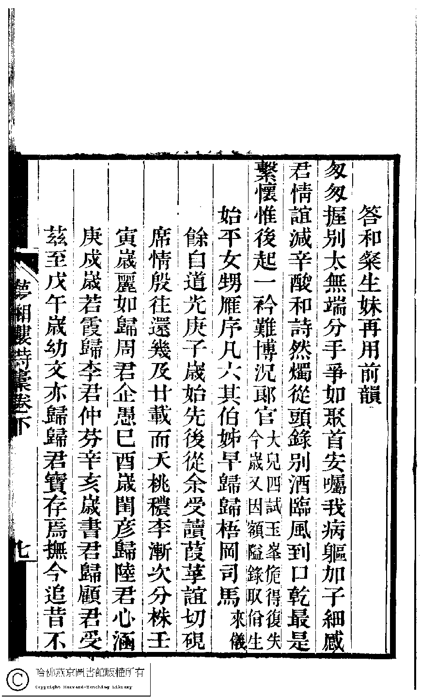 | (PRINT FRIENDLY VERSION) 夢湘樓詩稿﹕二卷﹐詞稿﹕一卷﹔繭香館吟艸﹕一卷﹐繡餘詞草﹕一卷(清宗婉等撰) : 夢湘樓詩稿﹕二卷﹐詞稿﹕一卷。清光緒六年(1880)常熟宗氏刻本 ![]() 頁碼 : 下.7a | 点 击 放 大 | 返回 |