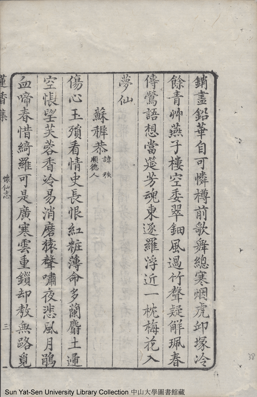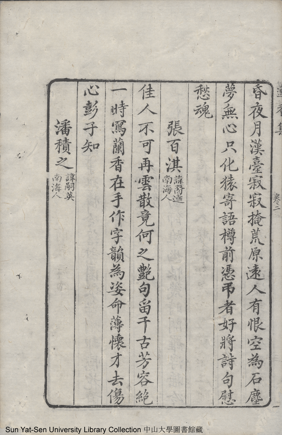 | (PRINT FRIENDLY VERSION) 蓮香集:五卷(明張喬撰)。清乾隆三十年(1765)順德梁釪重刻本 ![]() 頁碼 : 卷二3a | 点 击 放 大 | 蓮香集:五卷(明張喬撰)。清乾隆三十年(1765)順德梁釪重刻本![]() 頁碼 : 卷二2b | 点 击 放 大 | 返回 |