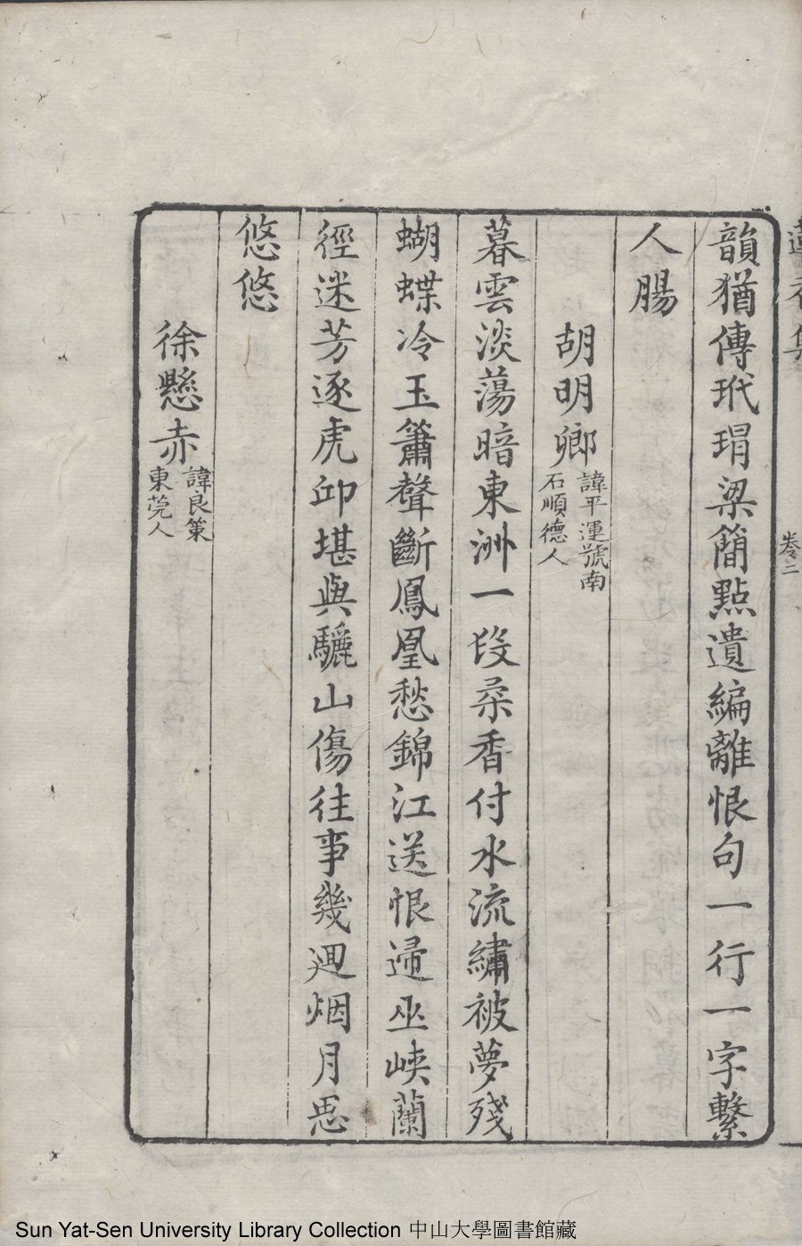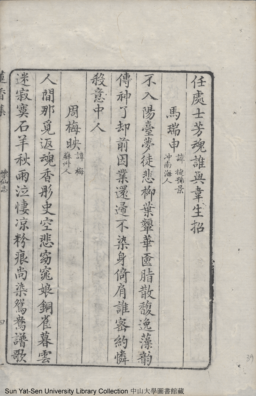 | (PRINT FRIENDLY VERSION) 蓮香集:五卷(明張喬撰)。清乾隆三十年(1765)順德梁釪重刻本 ![]() 頁碼 : 卷二4b | 点 击 放 大 | 蓮香集:五卷(明張喬撰)。清乾隆三十年(1765)順德梁釪重刻本![]() 頁碼 : 卷二4a | 点 击 放 大 | 返回 |