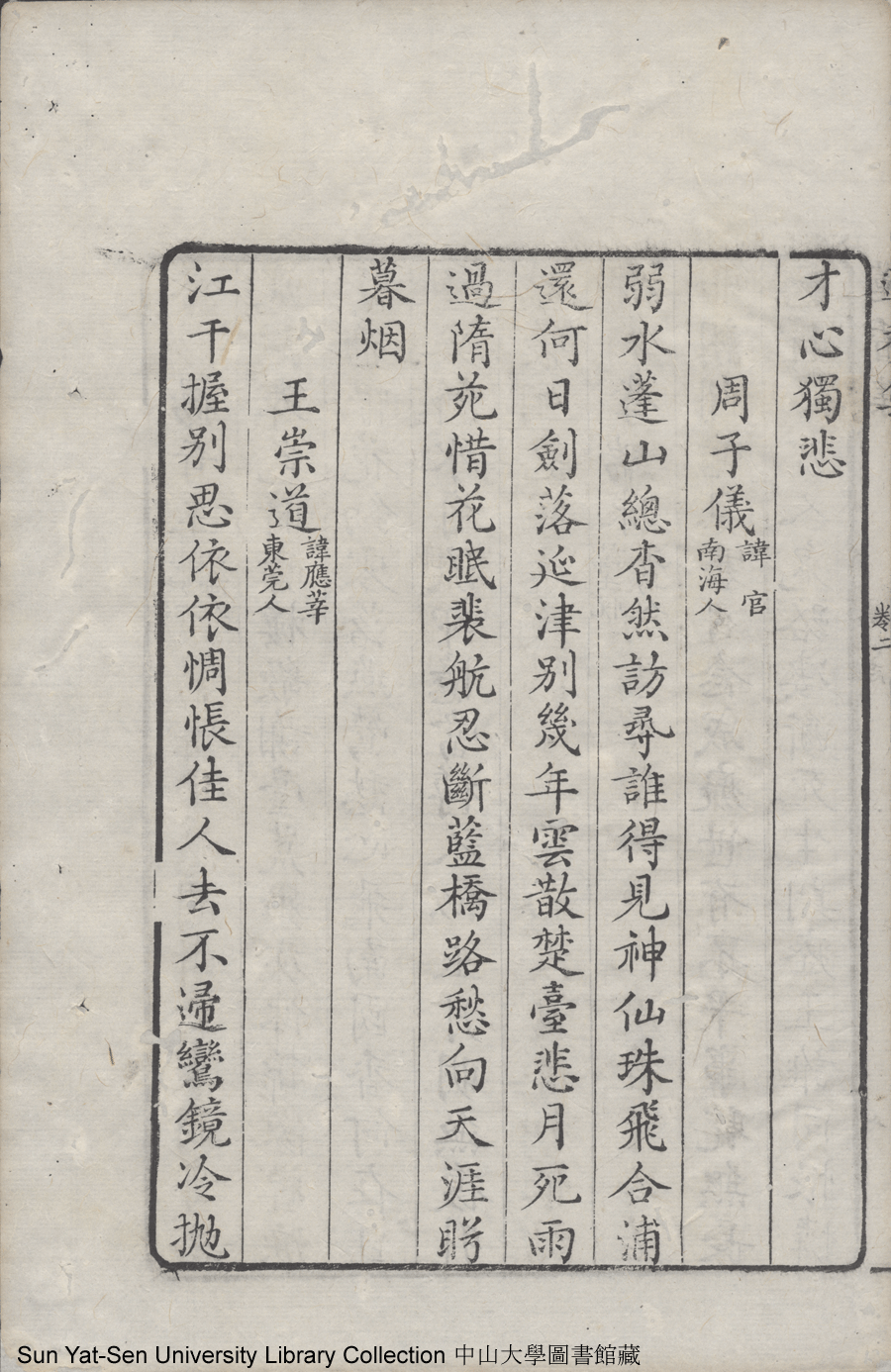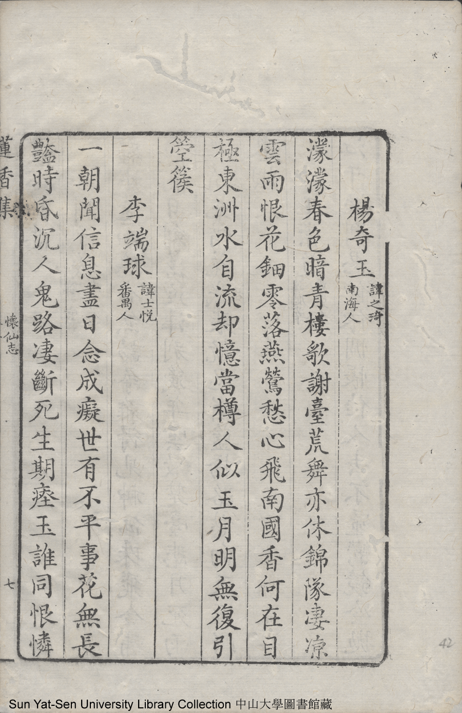 | (PRINT FRIENDLY VERSION) 蓮香集:五卷(明張喬撰)。清乾隆三十年(1765)順德梁釪重刻本 ![]() 頁碼 : 卷二7b | 点 击 放 大 | 蓮香集:五卷(明張喬撰)。清乾隆三十年(1765)順德梁釪重刻本![]() 頁碼 : 卷二7a | 点 击 放 大 | 返回 |