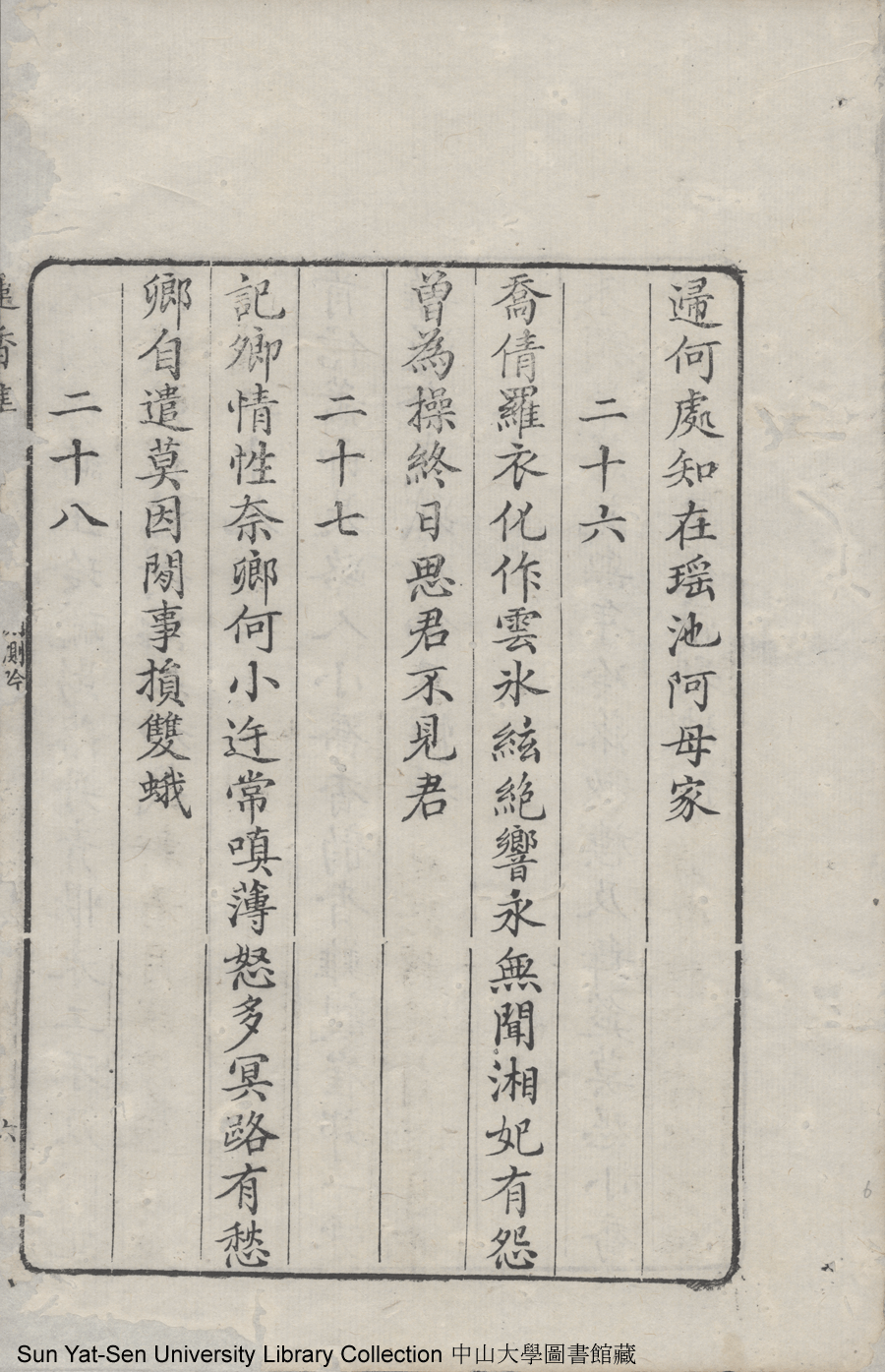 | (PRINT FRIENDLY VERSION) 蓮香集:五卷(明張喬撰)。清乾隆三十年(1765)順德梁釪重刻本 ![]() 頁碼 : 卷三6a | 点 击 放 大 | 返回 |