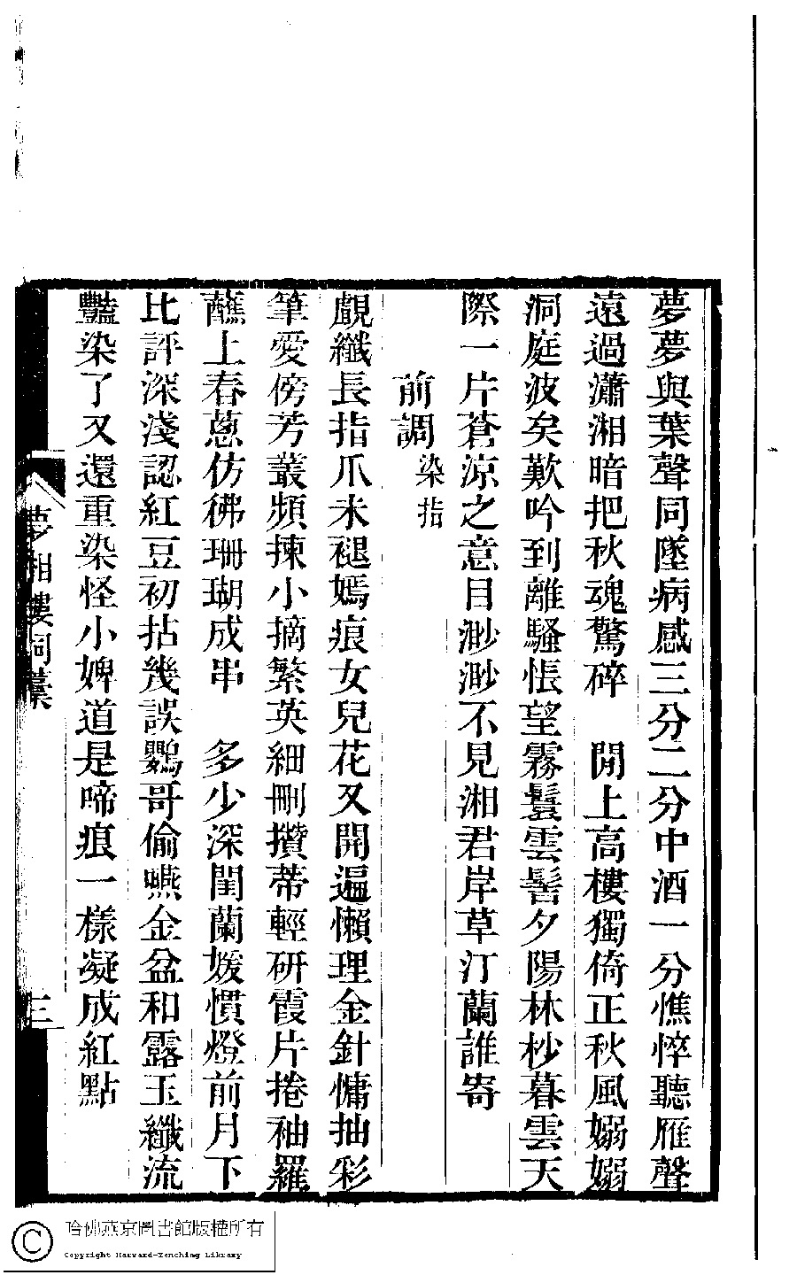| (PRINT FRIENDLY VERSION) 夢湘樓詩稿﹕二卷﹐詞稿﹕一卷﹔繭香館吟艸﹕一卷﹐繡餘詞草﹕一卷(清宗婉等撰) : 夢湘樓詩稿﹕二卷﹐詞稿﹕一卷。清光緒六年(1880)常熟宗氏刻本 ![]() 頁碼 : 詞.3a | 点 击 放 大 | 返回 |