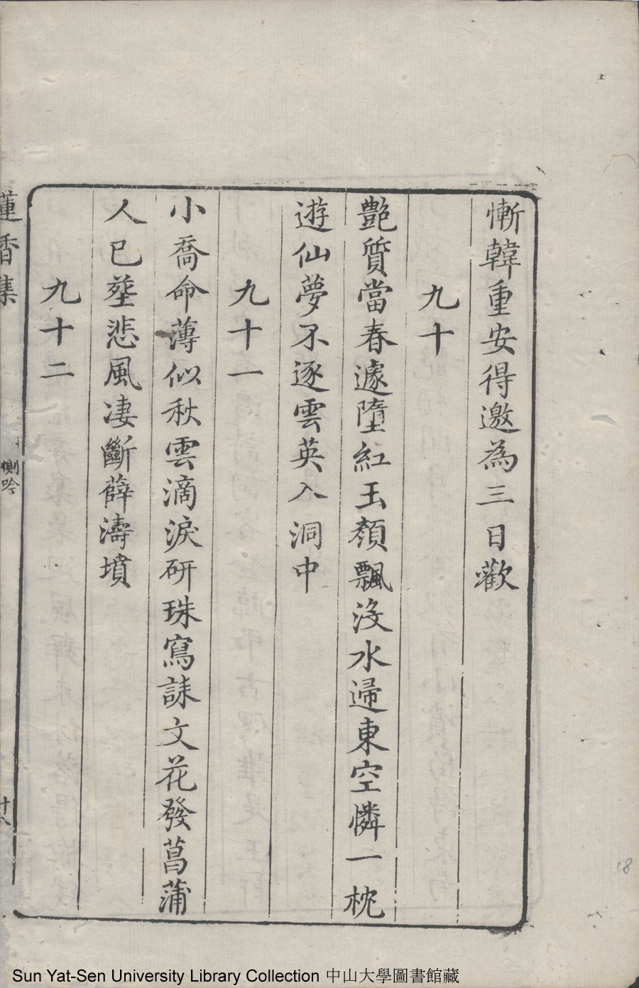| (PRINT FRIENDLY VERSION) 蓮香集:五卷(明張喬撰)。清乾隆三十年(1765)順德梁釪重刻本 ![]() 頁碼 : 卷三18a | 点 击 放 大 | 蓮香集:五卷(明張喬撰)。清乾隆三十年(1765)順德梁釪重刻本![]() 頁碼 : 卷三17b | 点 击 放 大 | 返回 |