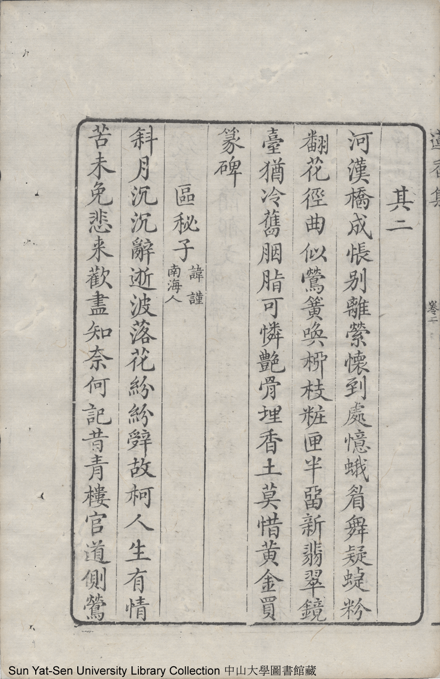 | (PRINT FRIENDLY VERSION) 蓮香集:五卷(明張喬撰)。清乾隆三十年(1765)順德梁釪重刻本 ![]() 頁碼 : 卷二12b | 点 击 放 大 | 蓮香集:五卷(明張喬撰)。清乾隆三十年(1765)順德梁釪重刻本![]() 頁碼 : 卷二12a | 点 击 放 大 | 返回 |