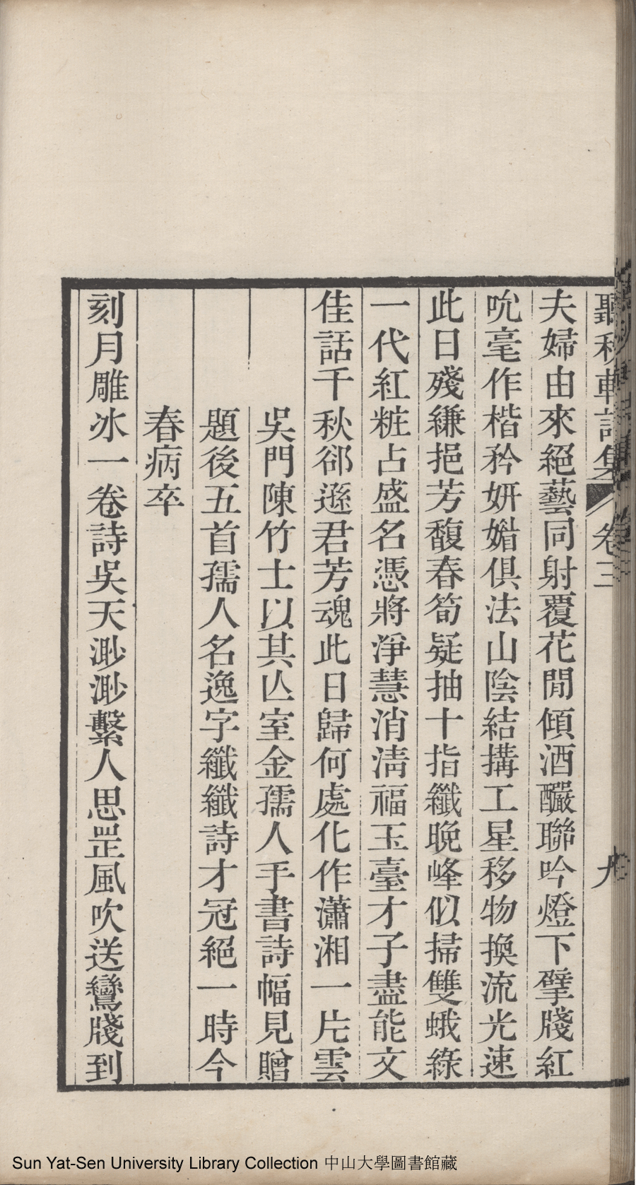 | (PRINT FRIENDLY VERSION) 聽秋軒詩集:六卷(清駱綺蘭撰)。清嘉慶金陵龔氏刻本 ![]() 頁碼 : 卷三10a | 点 击 放 大 | 聽秋軒詩集:六卷(清駱綺蘭撰)。清嘉慶金陵龔氏刻本![]() 頁碼 : 卷三9b | 点 击 放 大 | 返回 |