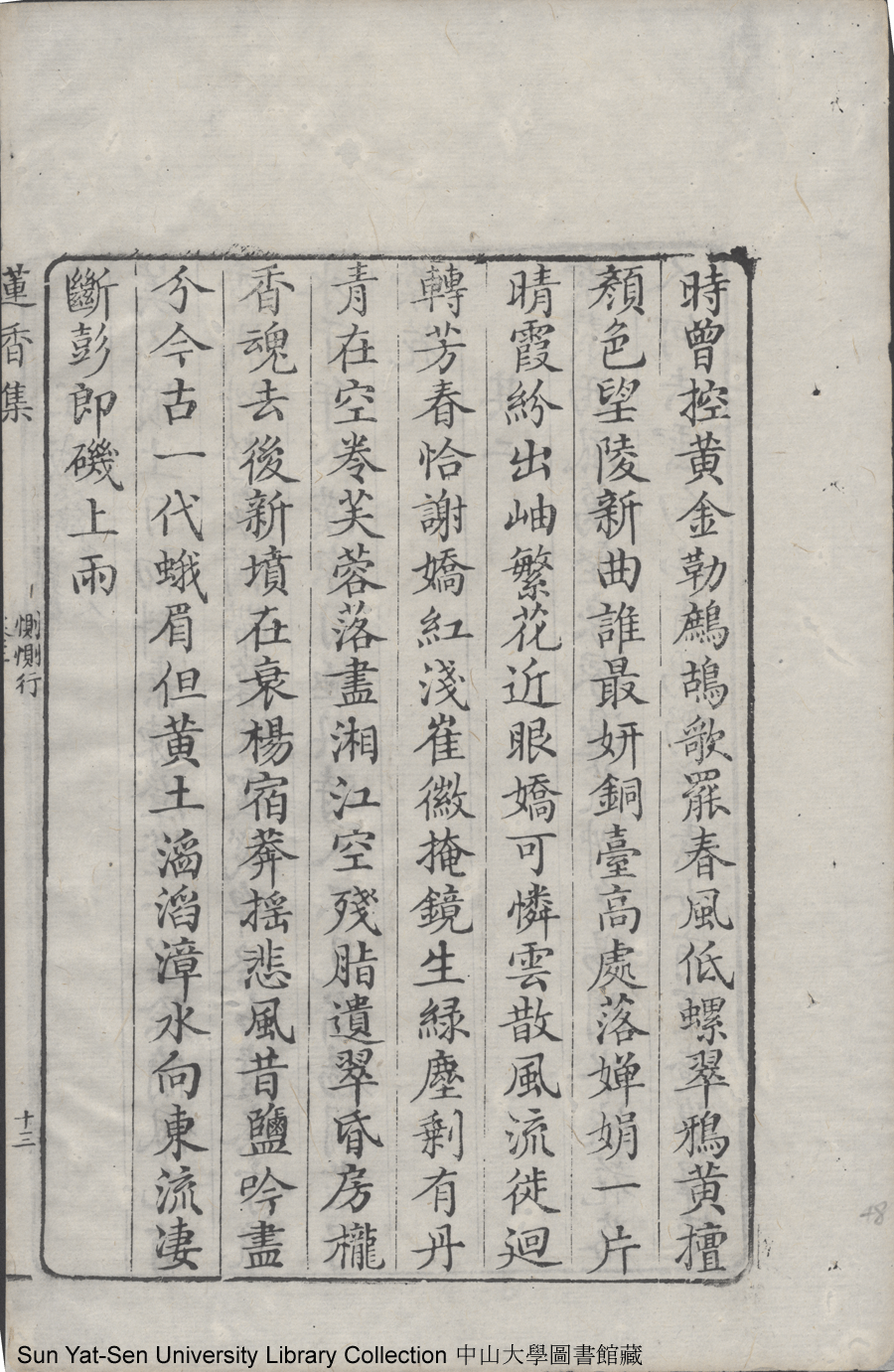| (PRINT FRIENDLY VERSION) 蓮香集:五卷(明張喬撰)。清乾隆三十年(1765)順德梁釪重刻本 ![]() 頁碼 : 卷二13a | 点 击 放 大 | 蓮香集:五卷(明張喬撰)。清乾隆三十年(1765)順德梁釪重刻本![]() 頁碼 : 卷二12b | 点 击 放 大 | 返回 |